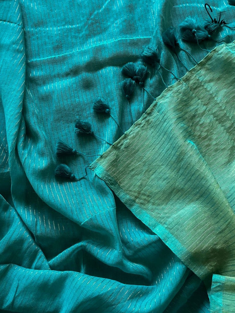 Find your voice in this handwoven blue and green Mashru saree. Made of the finest cotton and silk, this striking saree comes alive with subtle gold and silver zari detailing.