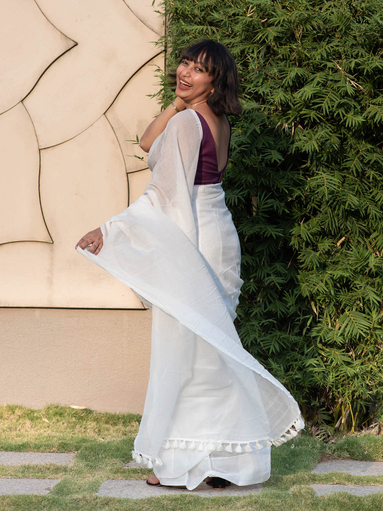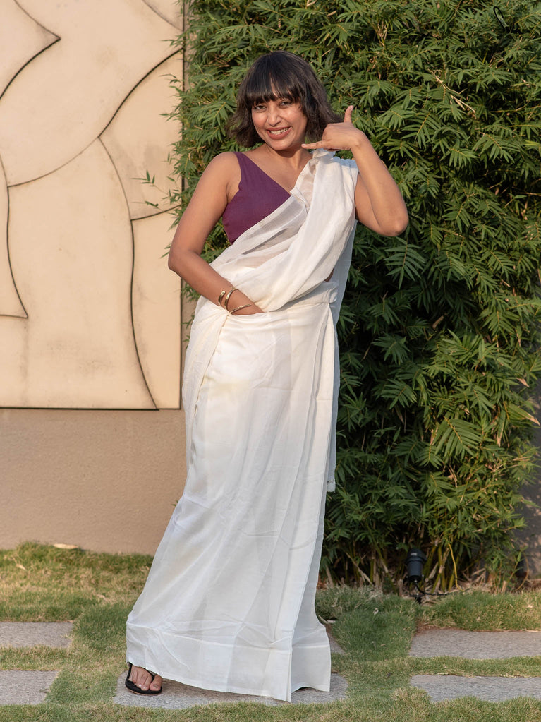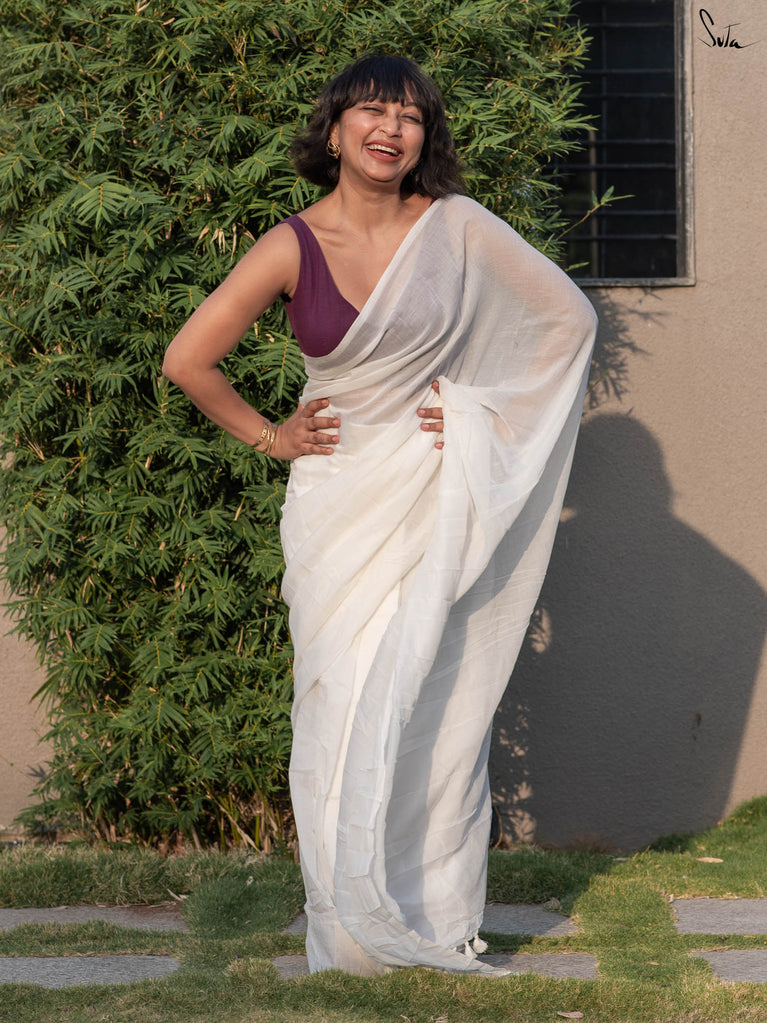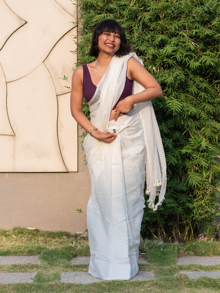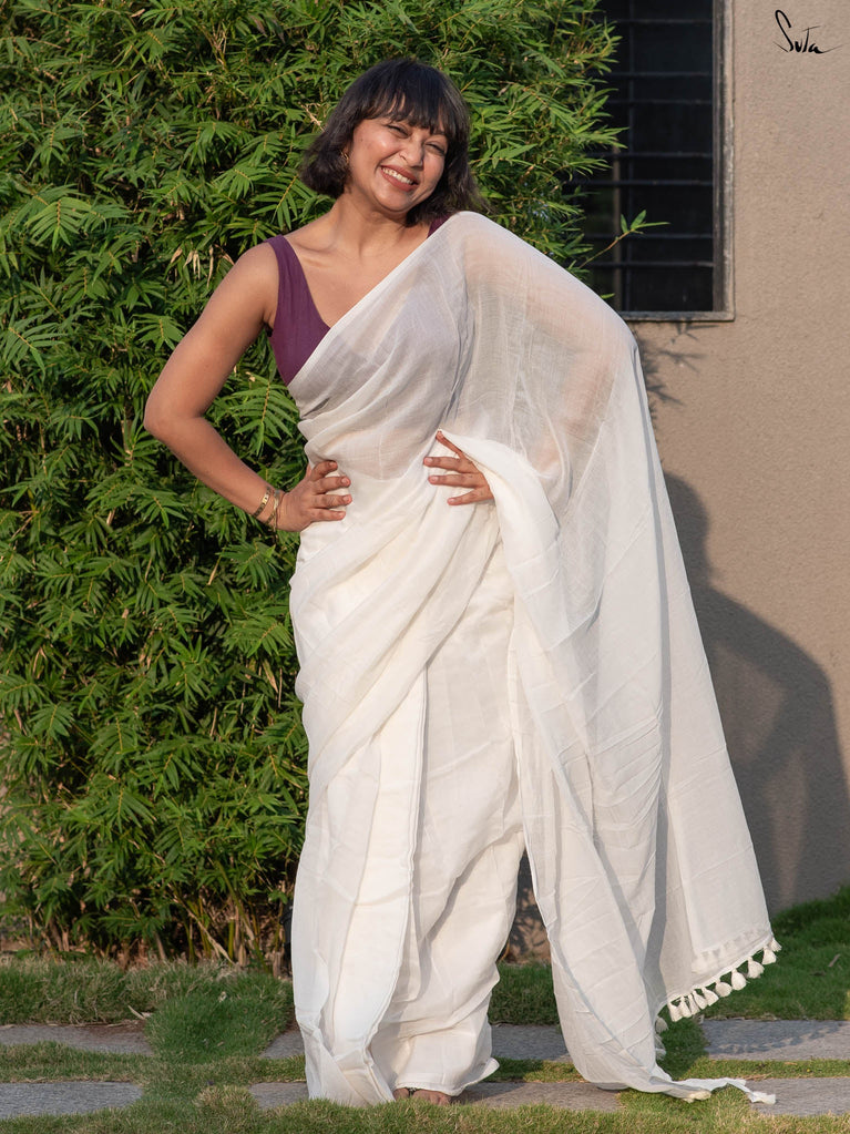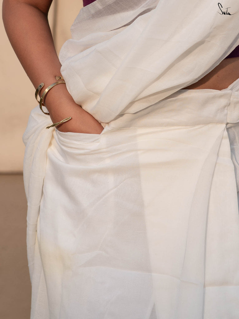 Pure, soft, and melt-in-your-heart beautiful. This white mul modal saree feels like a sweet memory in motion. Light, luminous, and lovely for any moment you want to keep close. With a cosy lining and a handy pocket, this ready-to-wear wonder wraps you in elegance with zero effort.