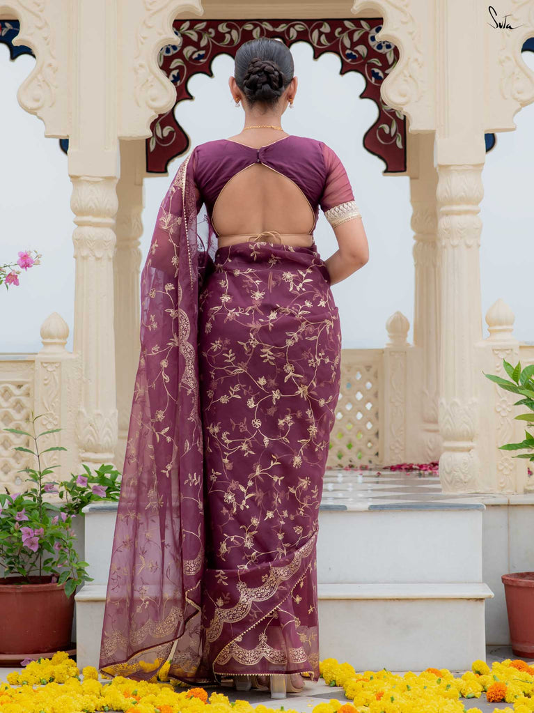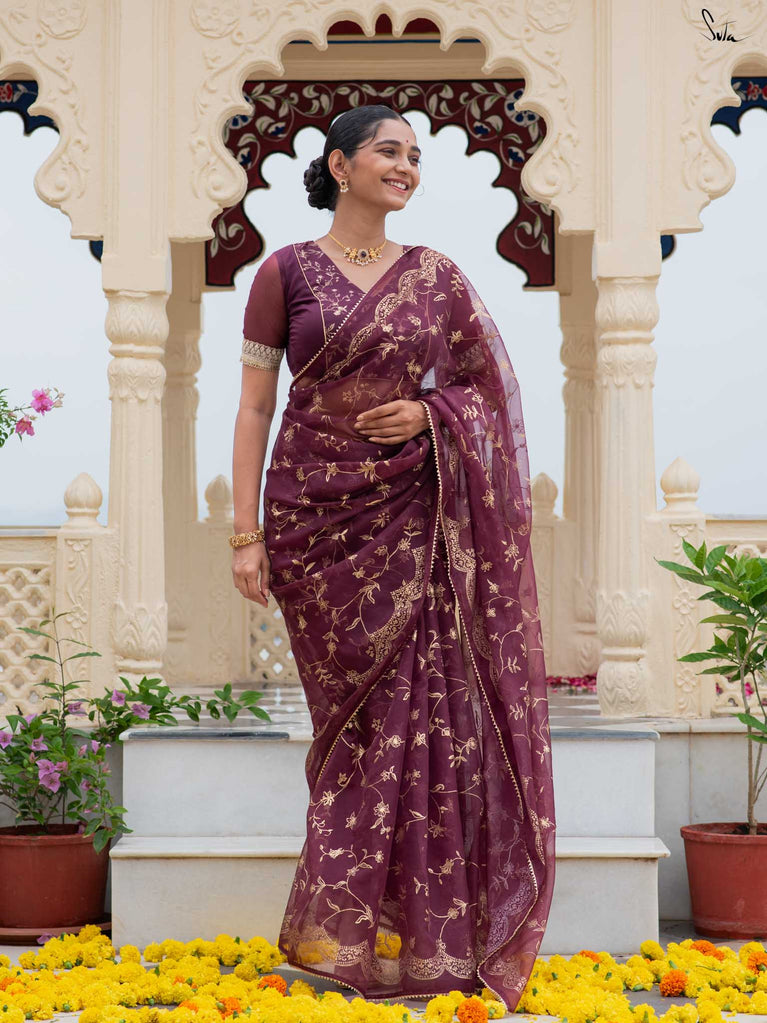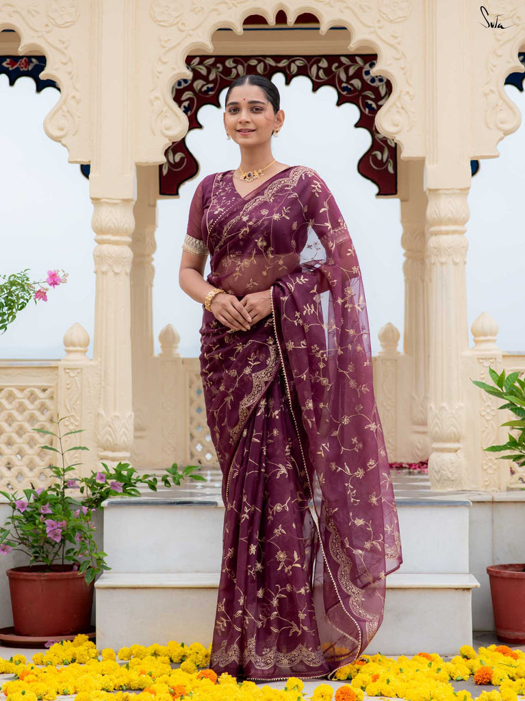 Make every celebration sparkle with Berry Foil, a sheer, lightweight organza saree in elegant mauve. Delicate golden foil prints shimmer across the drape, complemented by intricate scallop-edge detailing for a refined, chic finish.
