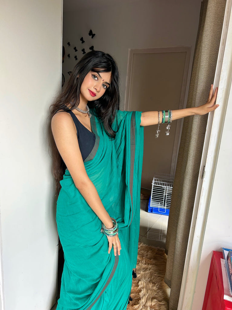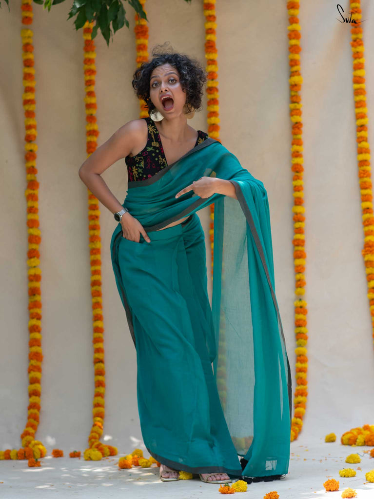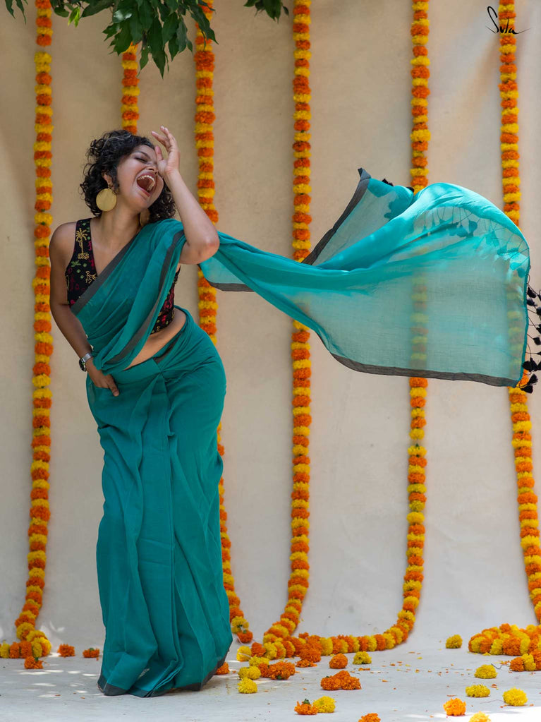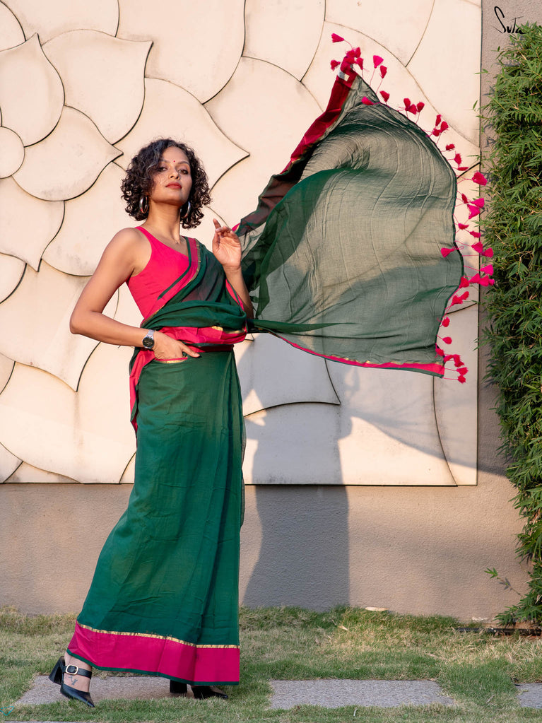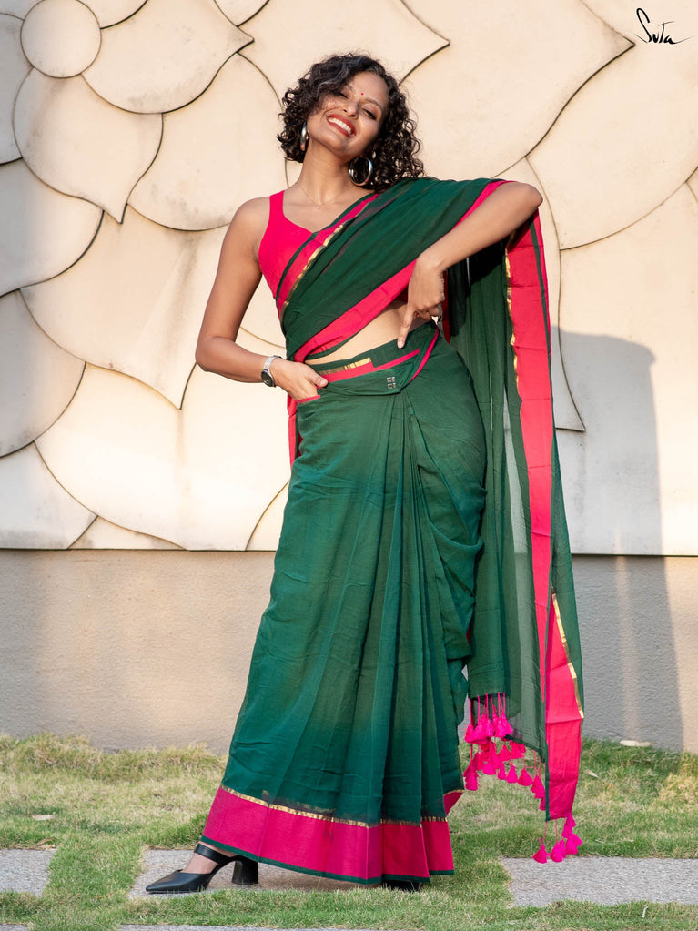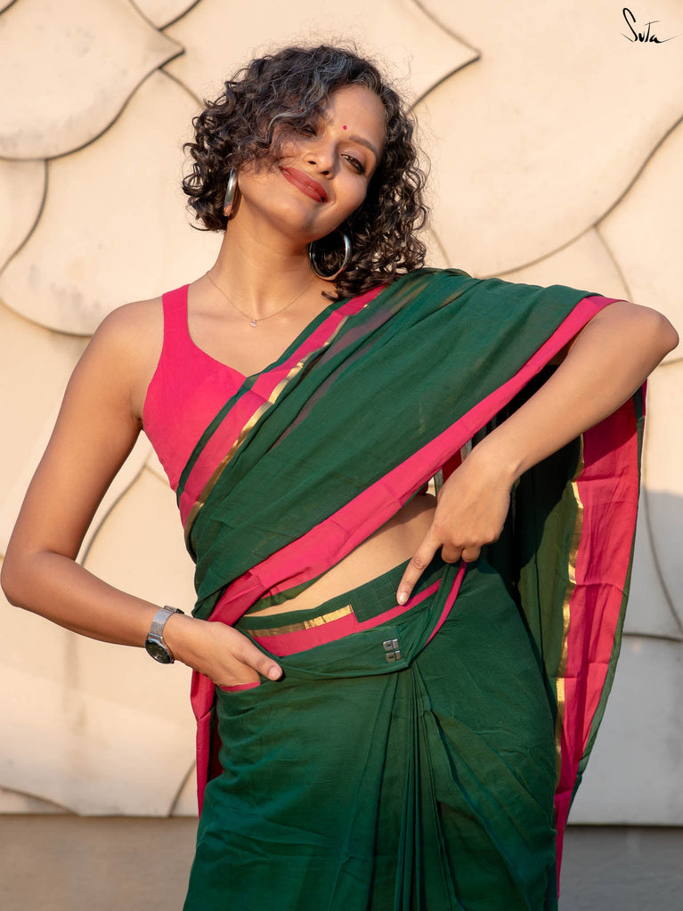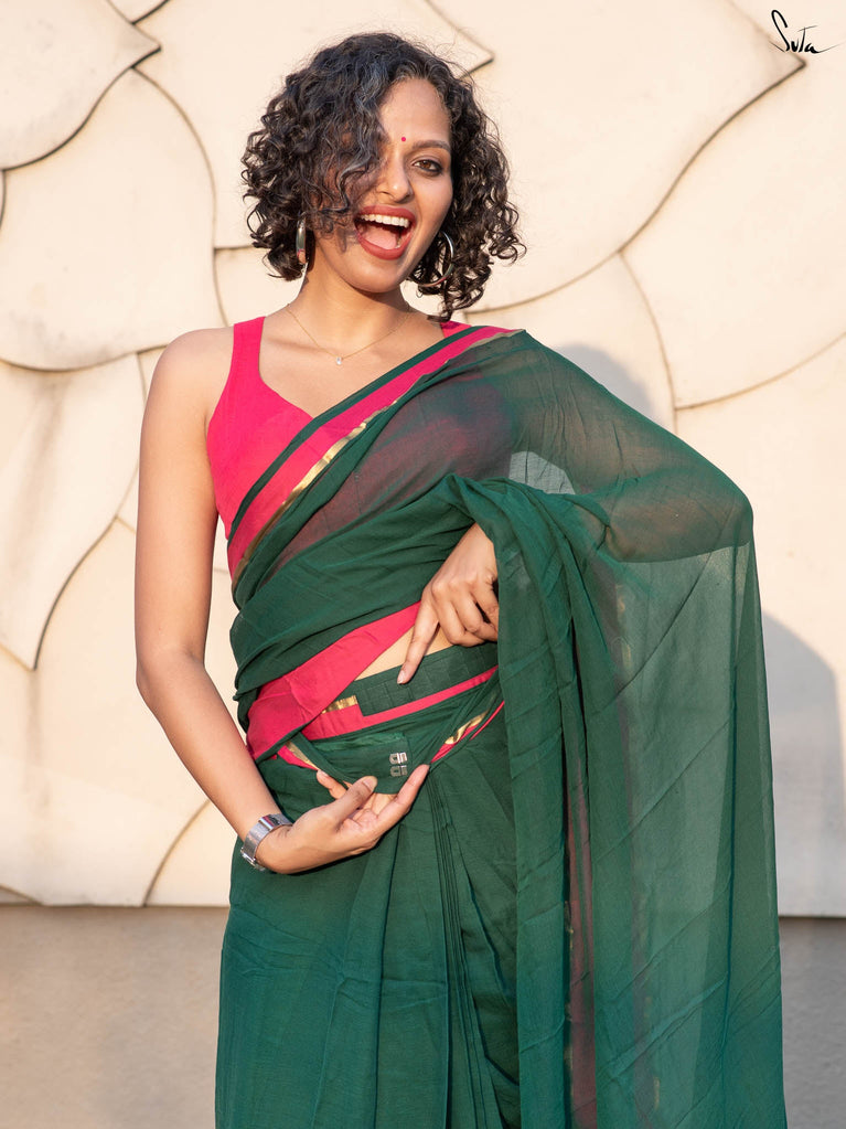 A blend of nature’s calm and vibrant charm, this green mul cotton saree is a breath of fresh air. With a delicate pink border that adds a playful yet sophisticated touch, it’s the perfect harmony of elegance and ease. Designed to wrap you in comfort, this ready-to-wear saree comes with a soft lining and a secret pocket, making it the ultimate fusion of style and practicality. Whether you're attending a day gathering or a casual celebration, Betul effortlessly brings grace to every occasion.