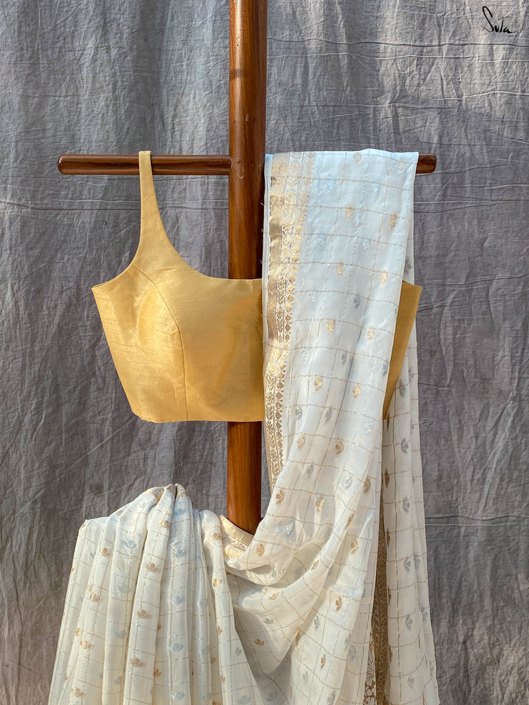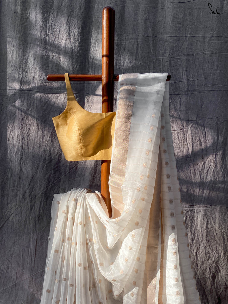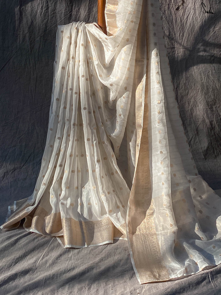 Dharani, a soulful saree made from delicate mul cotton, features a white and gold color scheme with a plain gold border that adds a touch of luxury. Adjustable loops, a small pocket, and matching lining ensure a perfect drape, making it ideal for any occasion in under 30 seconds.
