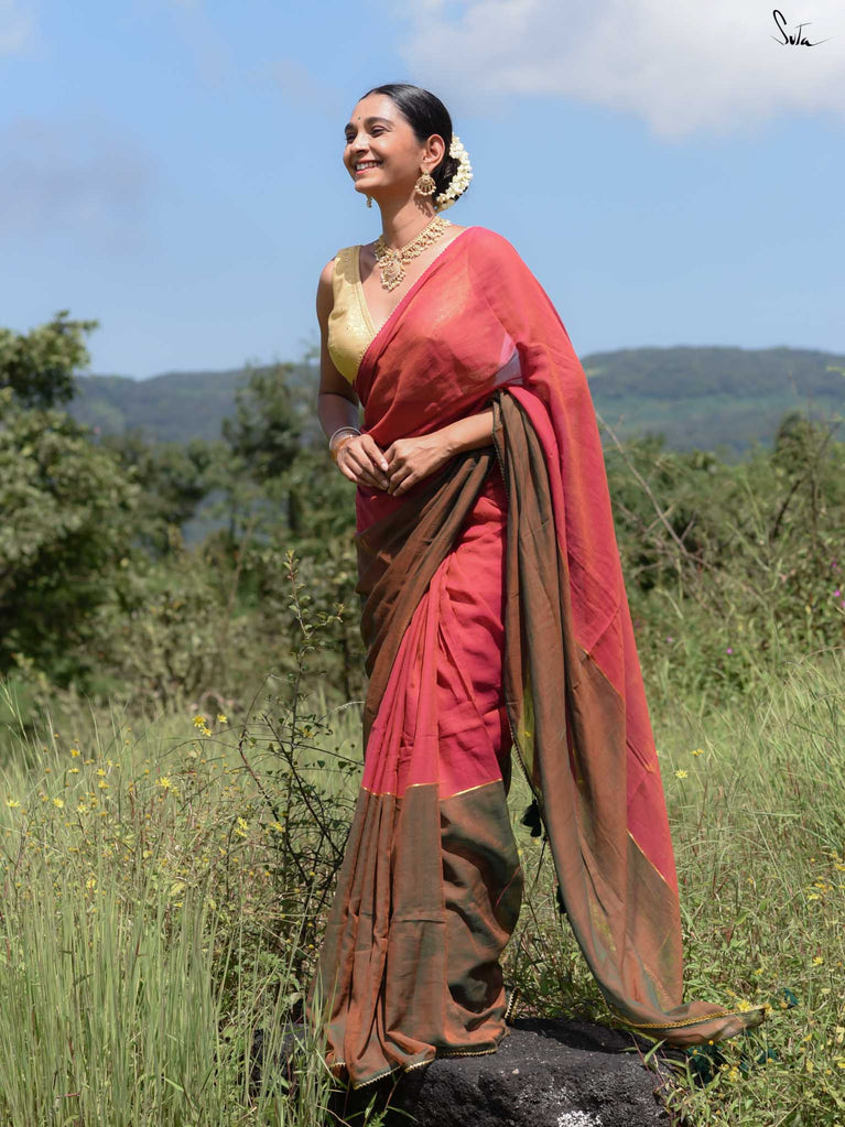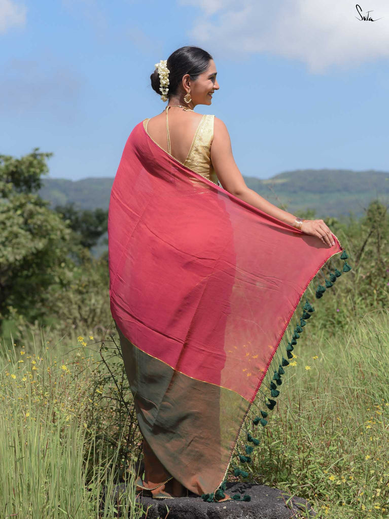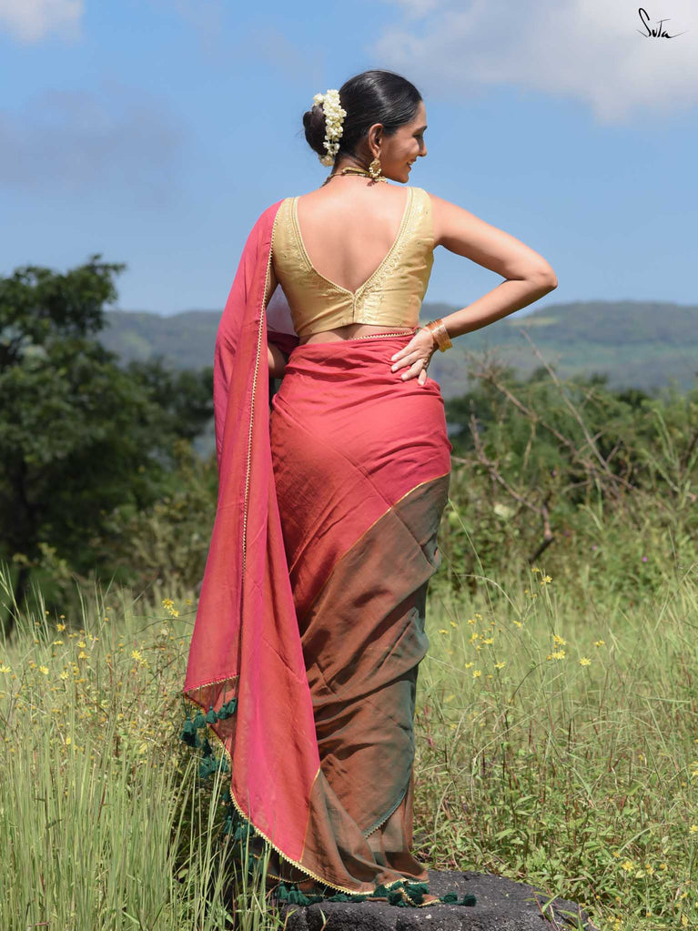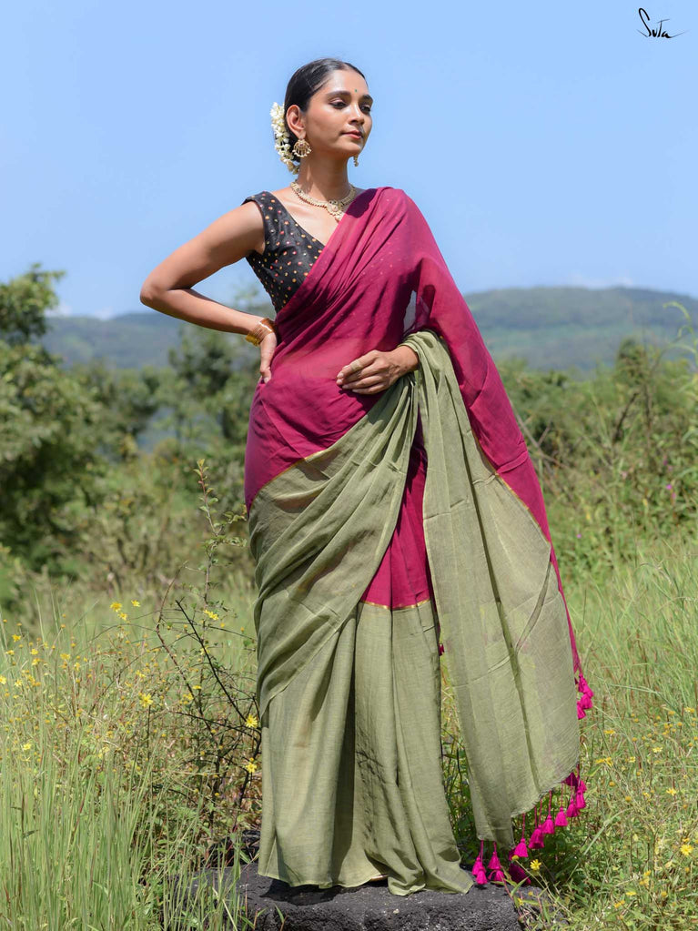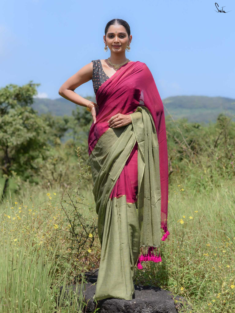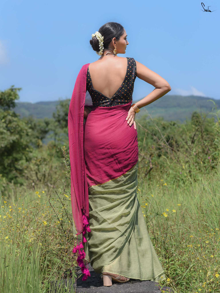 Celebrate vibrant contrasts with Dipped in Gulaab, a mul cotton saree that brings together pink and green in a striking half-and-half design. The center is highlighted with a delicate zari stripe, adding a subtle shimmer that enhances the elegance of the drape. Woven with care, this saree combines artisanal craftsmanship with everyday comfort, making it perfect for festive occasions or wedding celebrations.