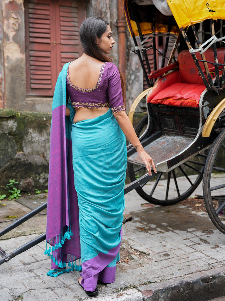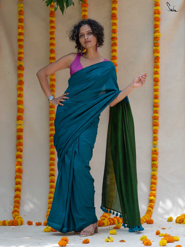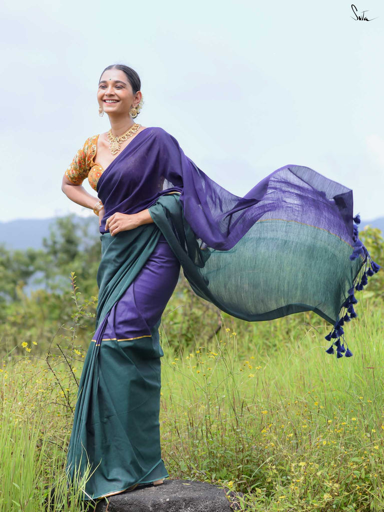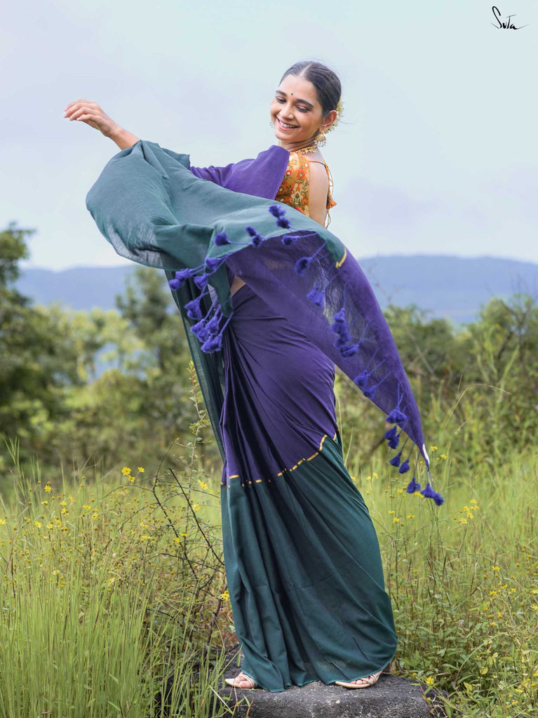 Celebrate color and craftsmanship with Dipped in Mulberry, a cotton-acrylic saree in a bold green-and-blue half-and-half design. A subtle zari stripe runs through the center, adding a touch of shimmer that elevates the saree’s festive charm. Woven carefully, it strikes the perfect balance between elegance and vibrancy - ideal for weddings, celebrations, or any occasion that calls for a statement drape.