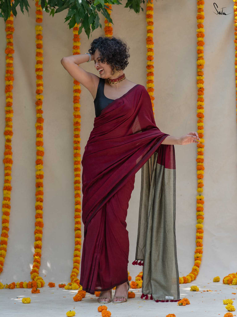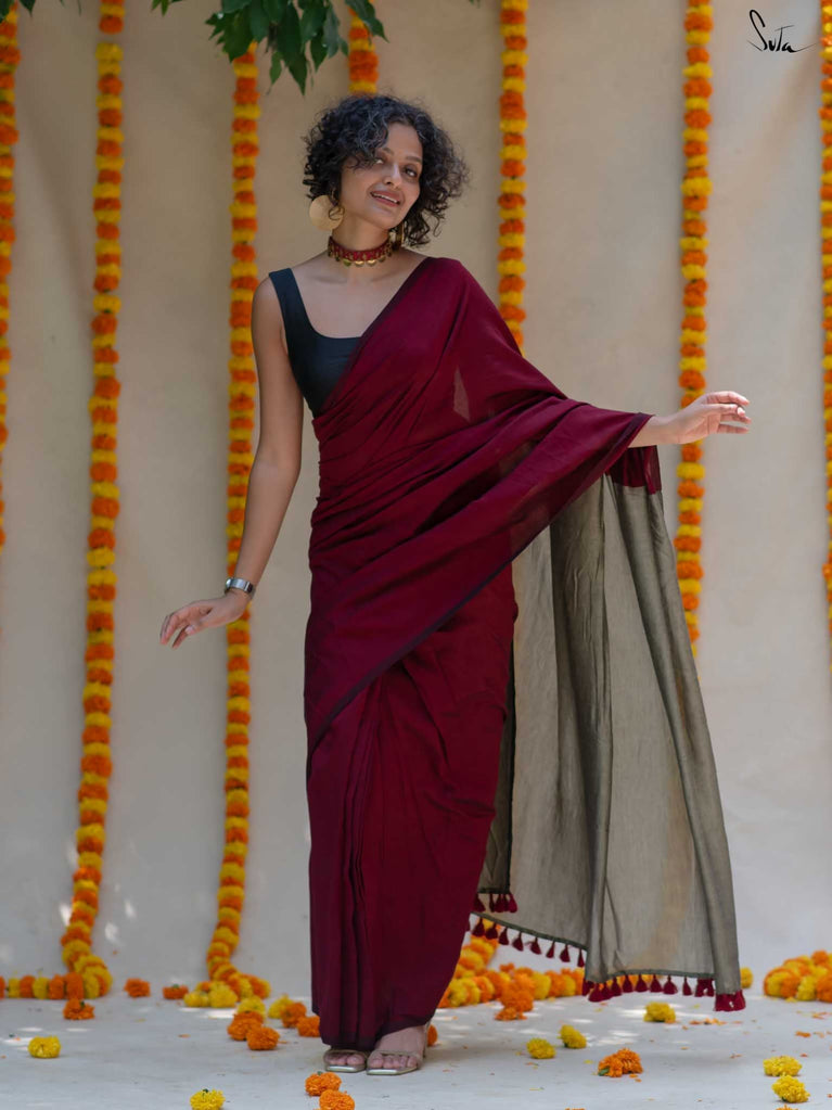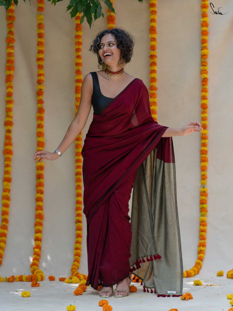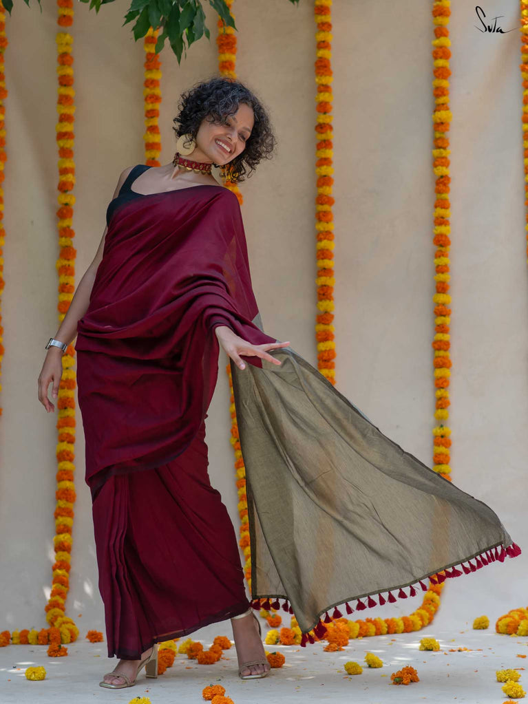 A glass of bold poured into the fabric. This wine crushed viscose saree is rich, moody, and unapologetically dramatic. Contrast tassels and a streak of gota at the border add that intoxicating flash of glam.