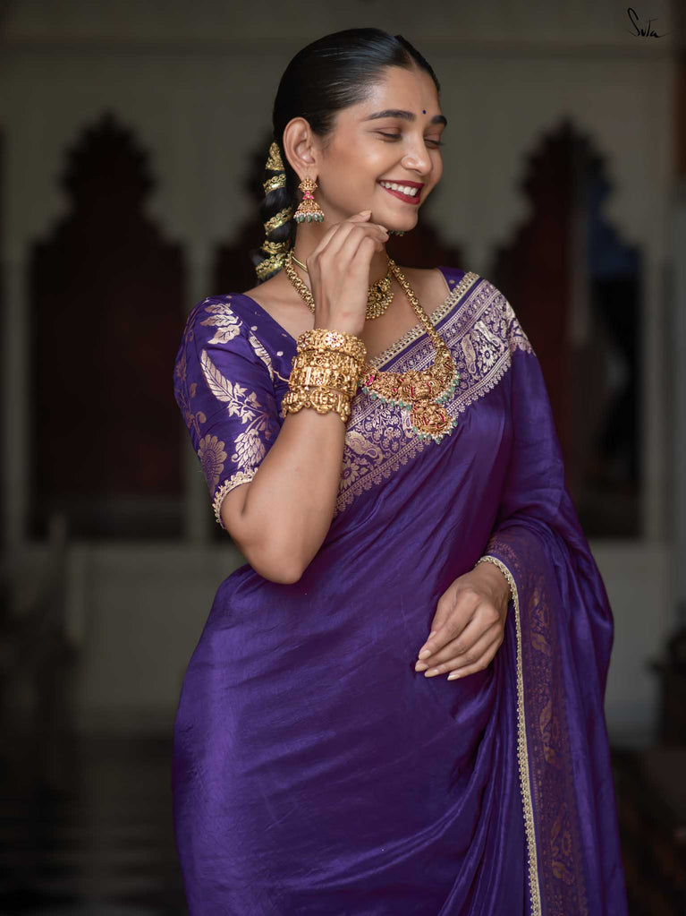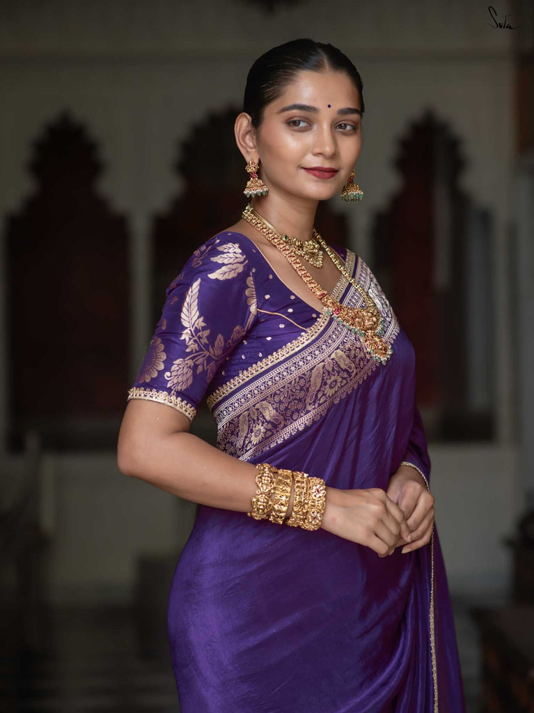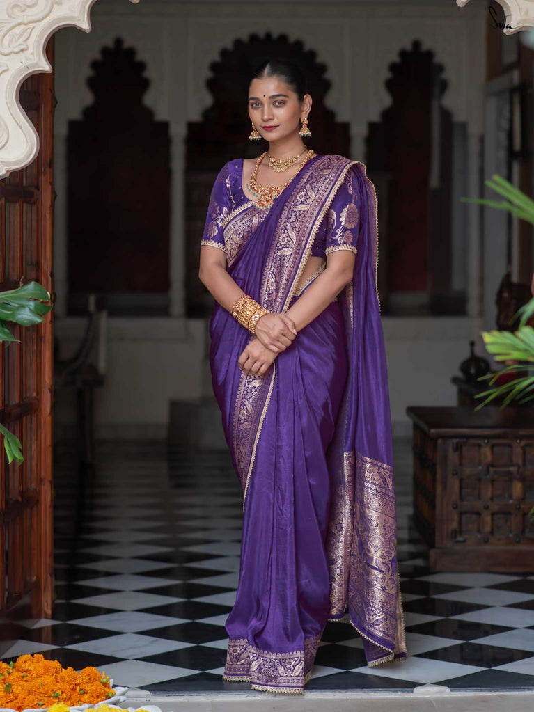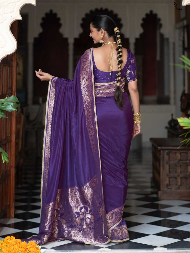 Turn heads at every evening celebration with Cocktail Hai, a regal purple viscose saree. Its smooth woven solid base is enhanced with delicate embroidered lace & brocade borders, creating a look that’s perfect for cocktail parties, wedding receptions, Cocktail evenings, and festive gatherings.A saree that balances sophistication with a hint of playfulness, ideal for celebrations where style meets elegance.