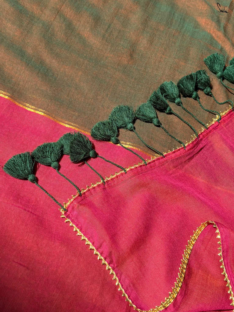 Soft never looked this stunning. This mauve crushed viscose saree carries a hush of romance with a streak of fire. The contrast tassels and gota border add to this personality.