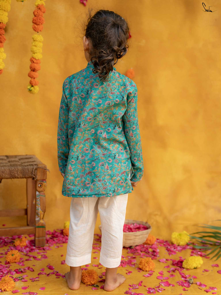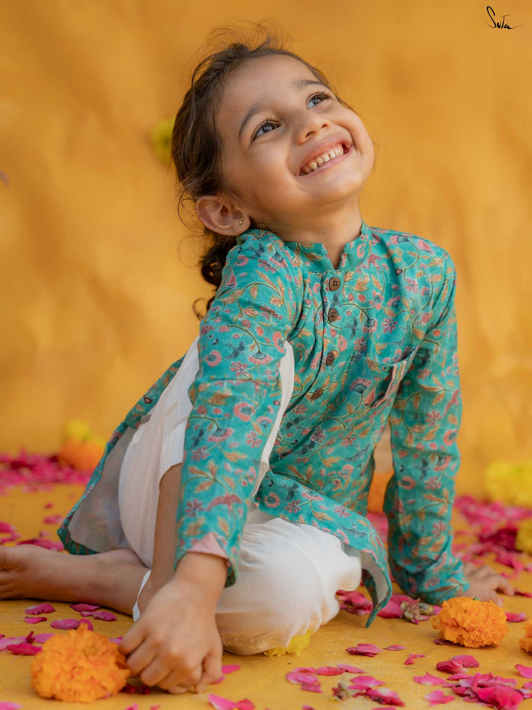 A song of colour and play, Bulbul is designed for the little gentlemen to shine. The kurta, in soft sushi voile, pairs lightness with festivity, while the cotton cambric pajama ensures all-day ease. The full-sleeve kurta features a cheerful digital print of flowers and birds, bringing a playful touch to traditional wear. A front button opening makes it easy to slip on, and side pockets add a practical twist for little treasures. The crisp white pajama pants come with an elasticated waistband and side pockets, perfect for morning aartis to evening fun.