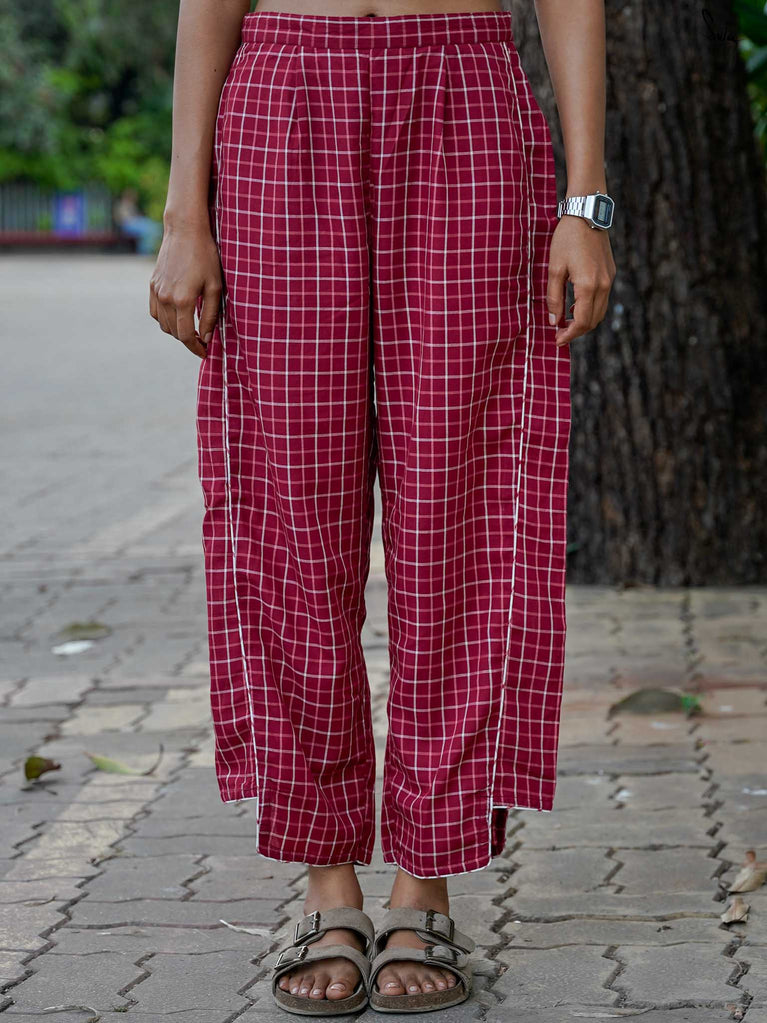 A gentle contrast, soft and striking all at once. This white checkered kurta set floats like a daydream, with a maroon yoke embroidered in florals adding quiet depth. Puff sleeves and a V-neckline bring structure, while contrast piping adds a refined touch. The matching pants offer a slit at the hem and contrast piping, allowing ease with every step.