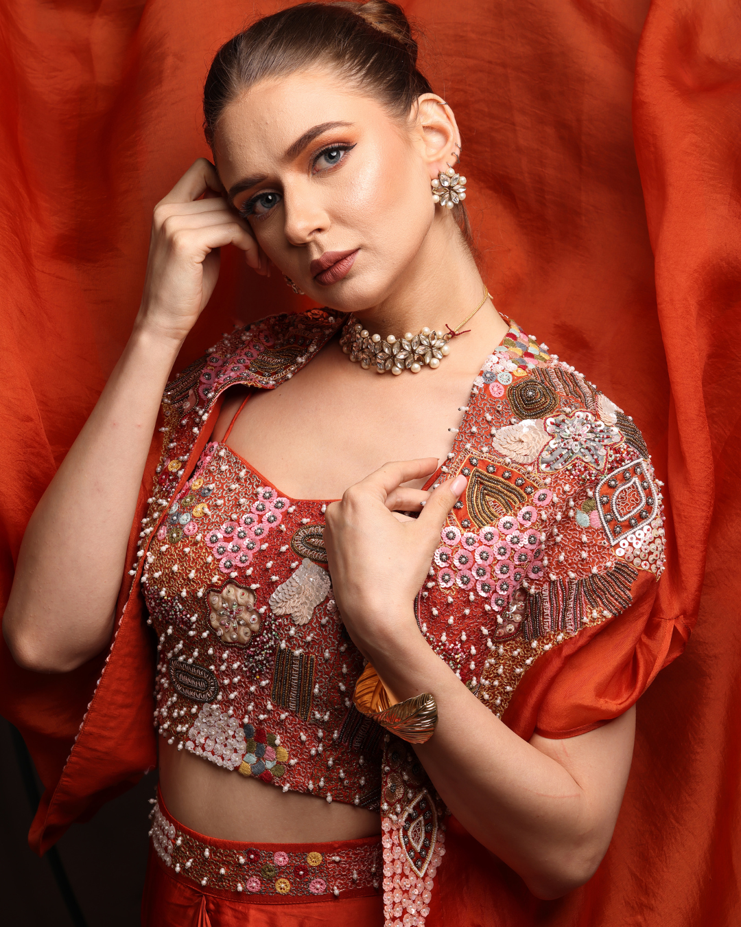 This elegant chinon fabric ensemble features a heavily embellished blouse adorned with intricate jarkan and moti work. Paired with a statement cape-style jacket featuring mixed handwork, the outfit offers a perfect blend of modern glamour and festive elegance—ideal for cocktail nights, receptions, and grand celebrations.