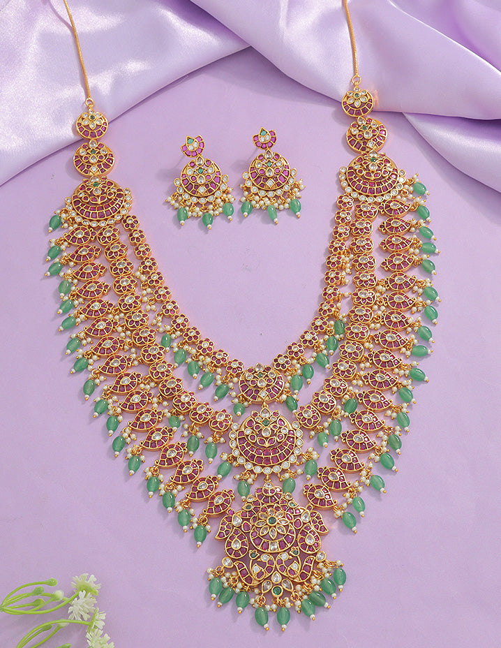 Designer Matt Rani Pink & Emerald Lakshmi Devi Long Haaram Set