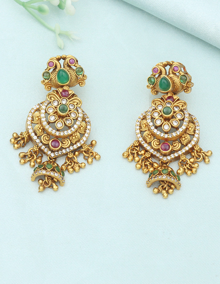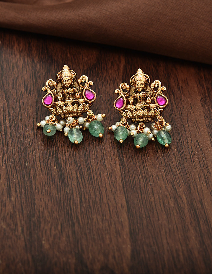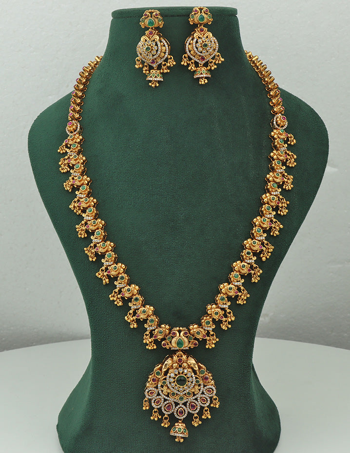 This stunning Matt Kempu Lakshmi Devi Long Haram Set features Ruby, Emerald CZ stones and rich emerald beads, crafted with intricate traditional artistry. Paired with elegant earrings, it's a perfect choice to make a bold, graceful statement at any festive or traditional occasion.