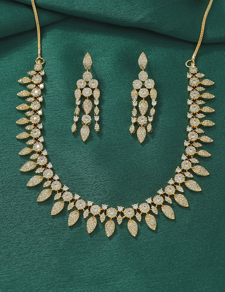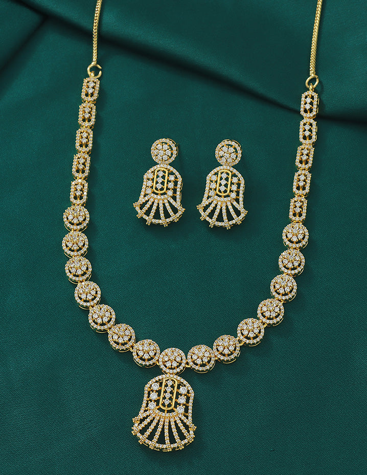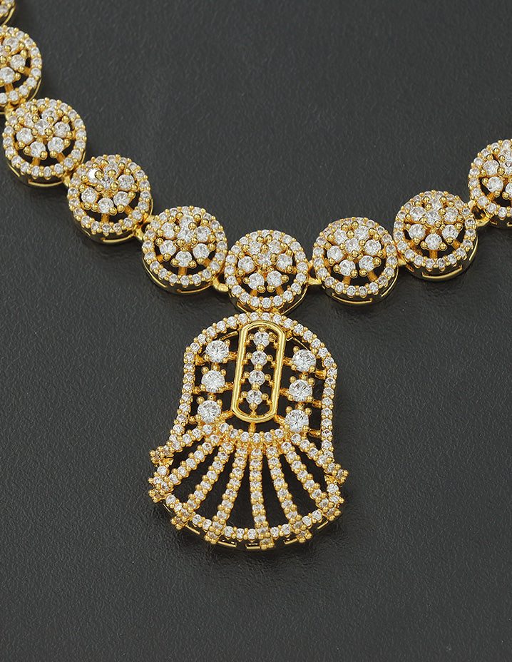 Elevate your style with this Designer Zirconia Elegance Necklace Set, featuring radiant white stones and a refined gold polish for timeless sophistication. Perfectly crafted to add a luxurious touch to any ensemble.