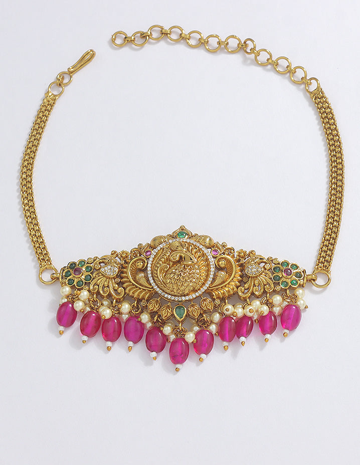 Radiate traditional charm with this Matt gold-finish Bajuband, adorned with floral motifs, a striking stone centerpiece, green accents, and elegant with pearl drops—perfect for festive and bridal wear.