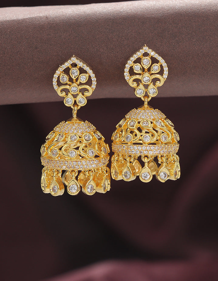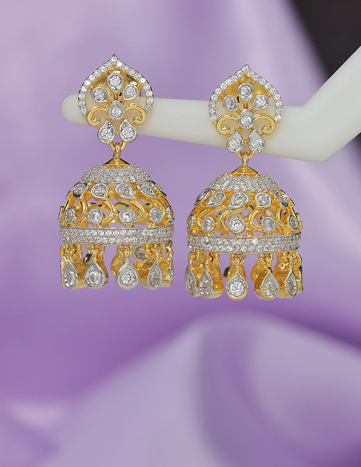 Designer earrings are classic jhumka-style danglers with a fusion of traditional and contemporary design. The bell-shaped drop is richly embellished with white stones and tear-drop dangles, paired with a sparkling oval top.