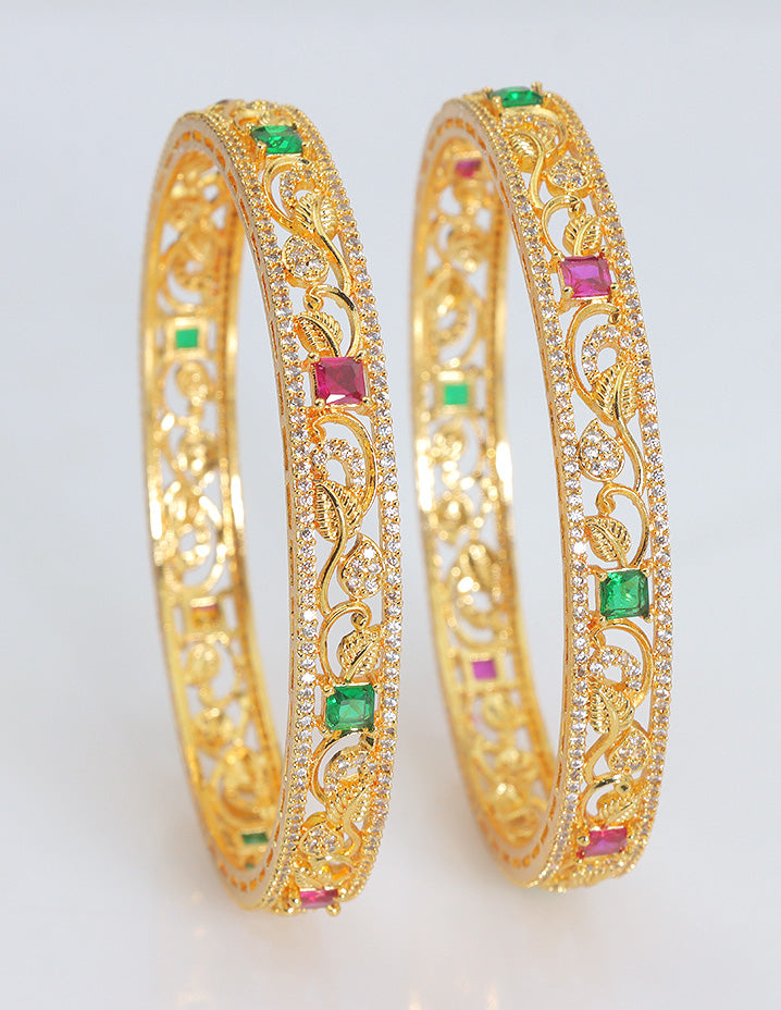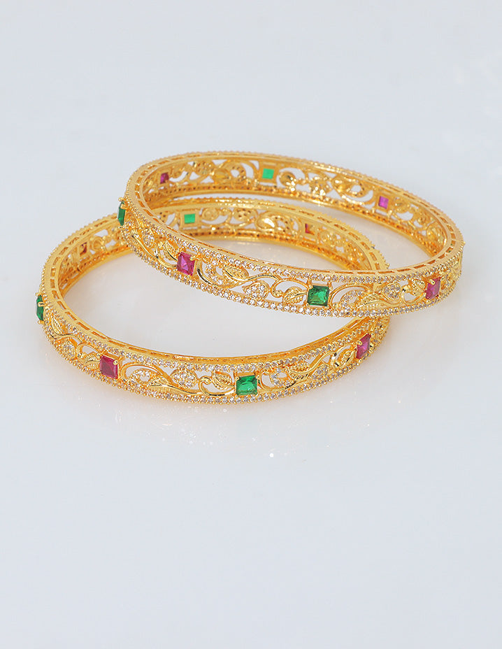 Make a timeless statement with our Zircon Gold Polish Bangles, featuring delicate floral CZ design. Elegant solo or stacked!