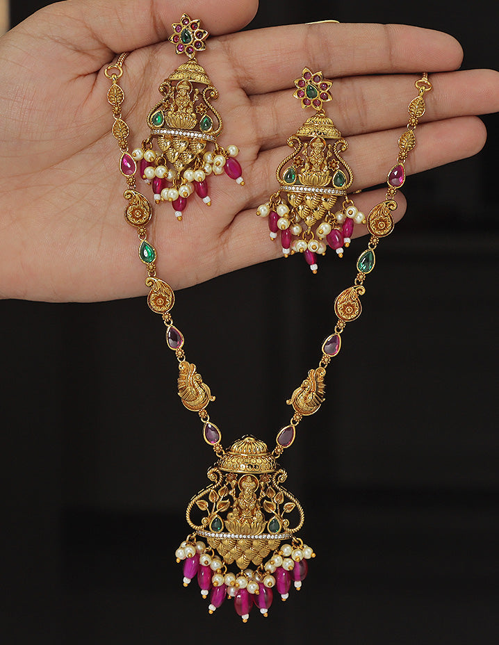 A majestic gold-plated necklace set adorned with vibrant magenta beads, emerald and ruby accents, and intricate temple motifs. The divine Lakshmi design and rich detailing exude traditional charm, perfect for bridal and festive elegance.