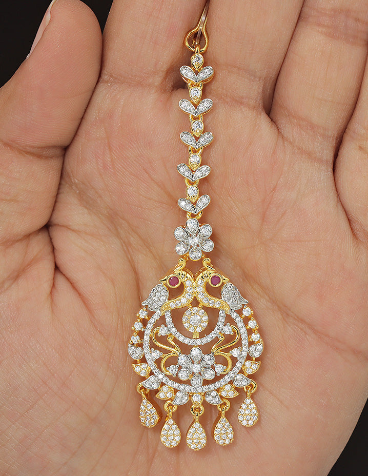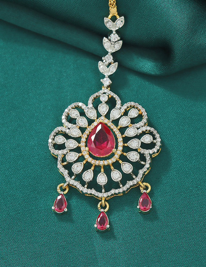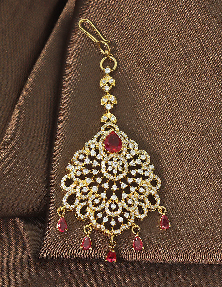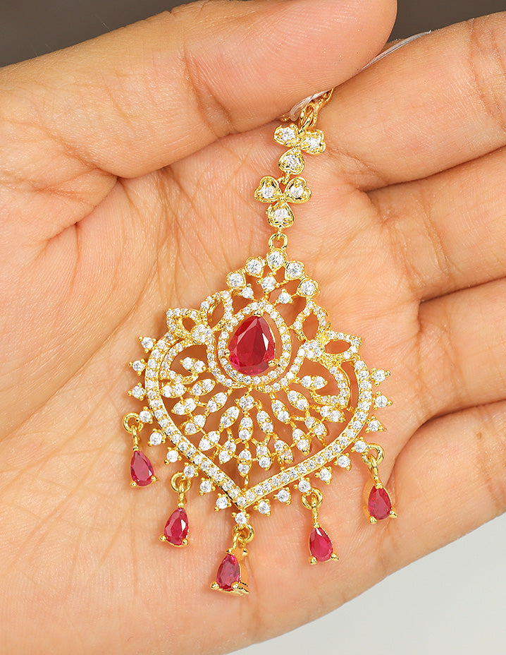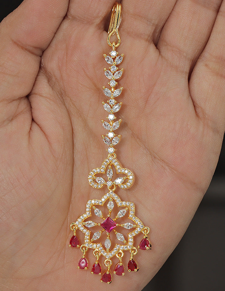 Looking for a Maang tikka to match your Gold jewelry? We highly recommend this one. This Cz Maang tikka with colossal pattern, The studded ruby & white with cz stones and the dangling pearl sit flawlessly with the rest of the design.