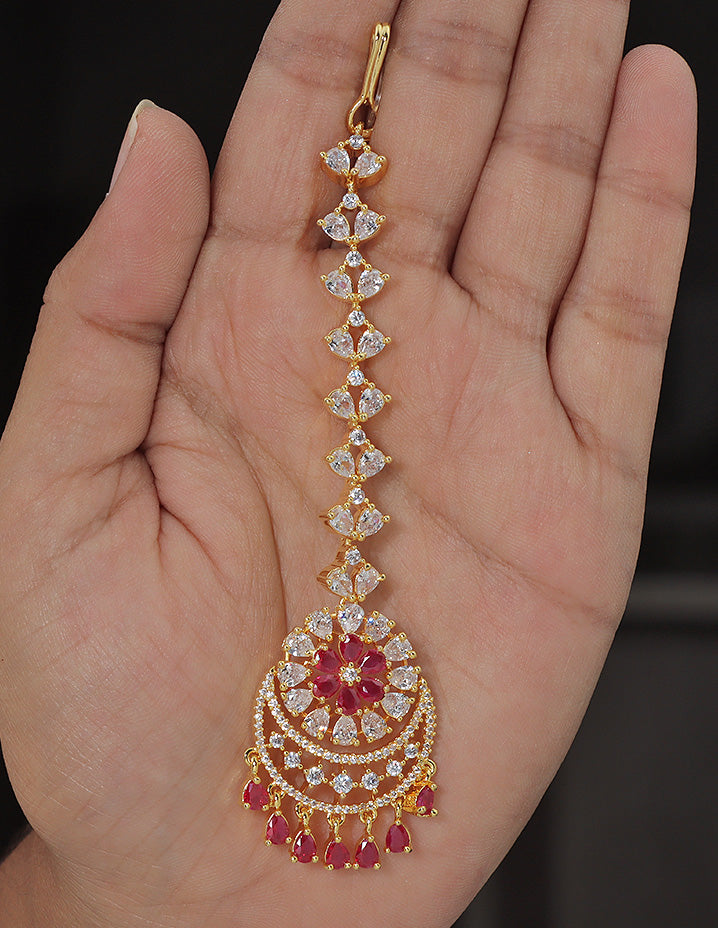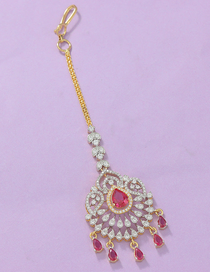 A dazzling maang tikka adorned with a bold rani pink teardrop centerpiece, surrounded by intricate patterns of CZ stones arranged like radiant petals. Finished with dangling ruby drops for an added touch of elegance and grace — perfect for bridal or festive looks.
