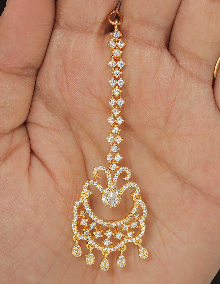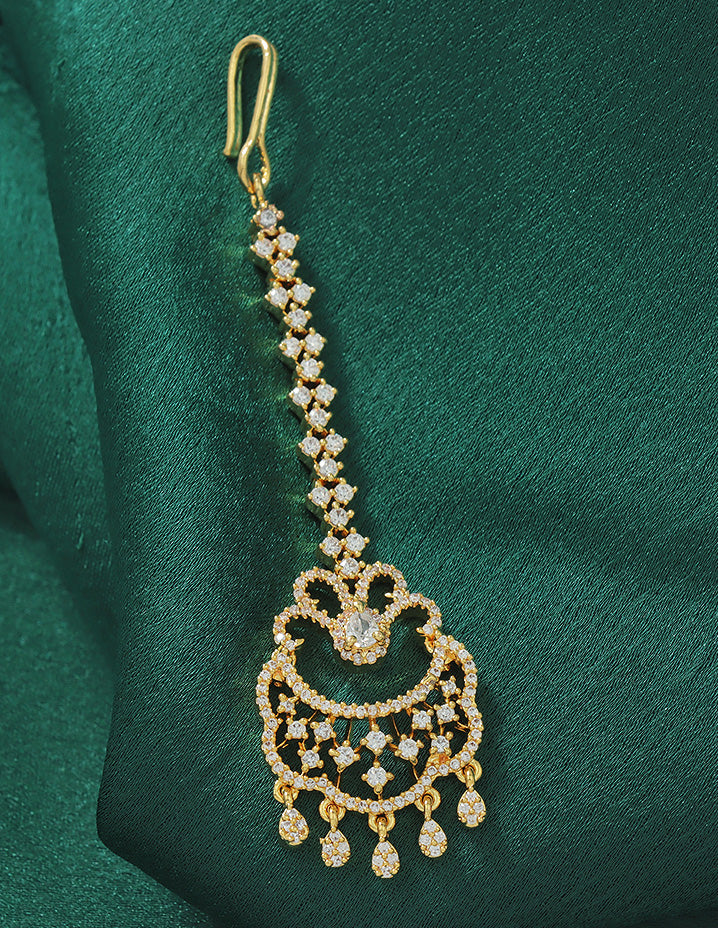 Elevate your traditional look with our Designer Zirconia Maang Tikka. High-quality zirconia, GJ polish options, and elegant colors including Green + White make this a must-have for traditional occasions.