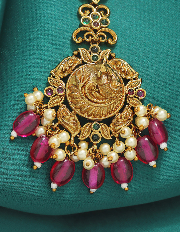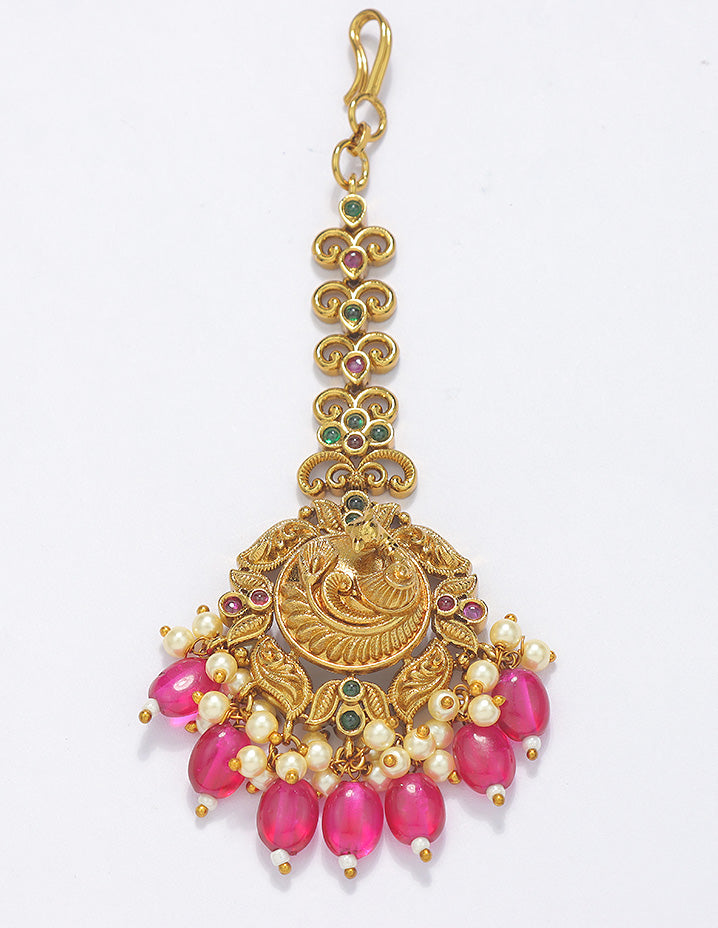 Antique Zirconia Stone Maang Tikka With Ruby Beads