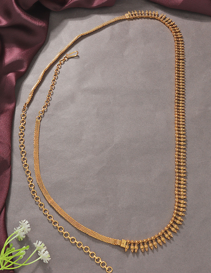 The Designer Mango Shape Chain Vaddanam appeals to customers seeking traditional elegance with a modern touch. It offers a unique mango-shaped design that enhances ethnic attire with sophistication and craftsmanship.