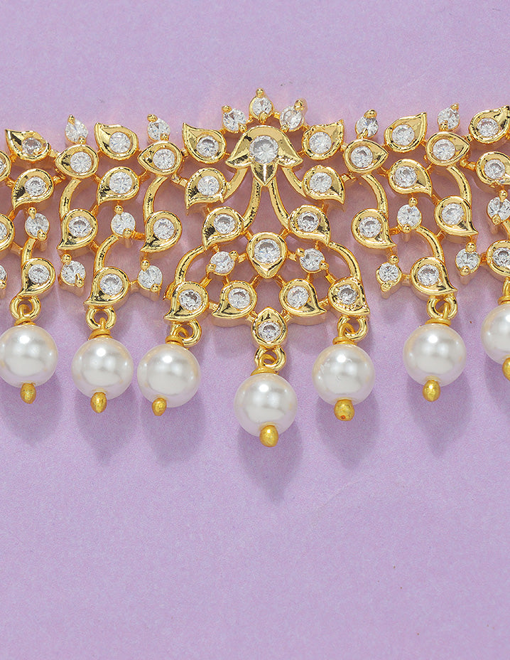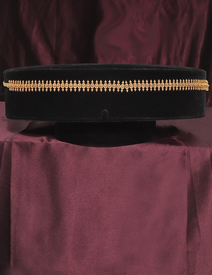 Elevate your traditional attire with this Designer Gold Polish Zirconia Chain Vaddanam, expertly crafted with a blend of gold for enhanced durability and lustrous shine. Adorned with sparkling zirconia stones, this chain vaddanam offers refined elegance and complements various ethnic styles, making it perfect for weddings and special occasions. Its intricate design ensures a comfortable yet secure fit, adding both sophistication and grace to your ensemble.