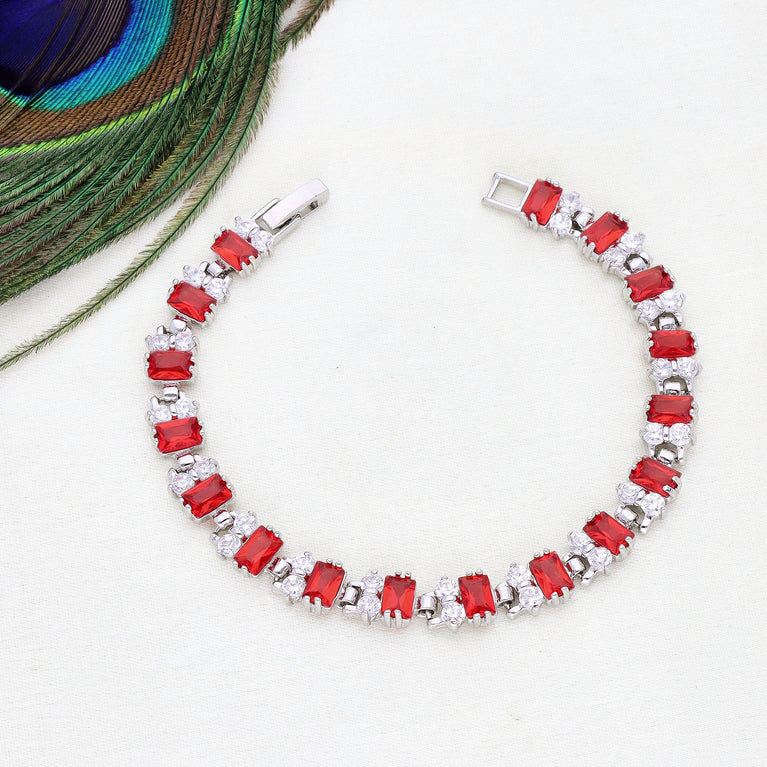 Elegant Rhodium-plated chain bracelet adorned with sparkling Ruby stones. Perfect for festive vibes or party nights—style that stands out effortlessly!