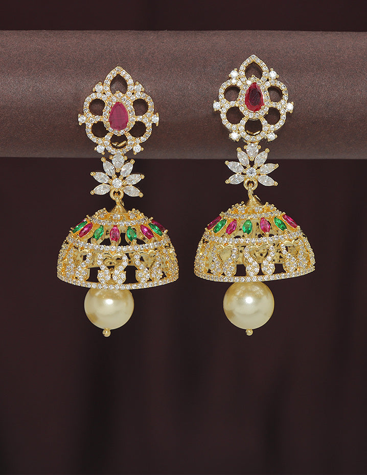 Shine bright with these gold-plated jhumkas, studded with ruby & emerald and white American diamonds. A bold fusion of elegance and tradition — perfect for any occasion!
