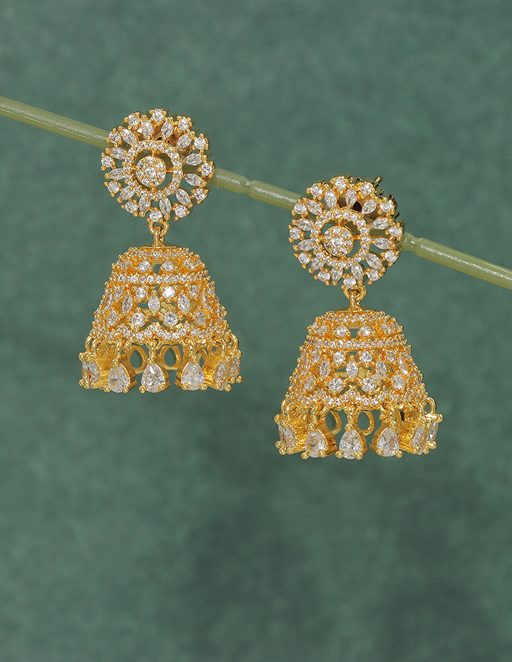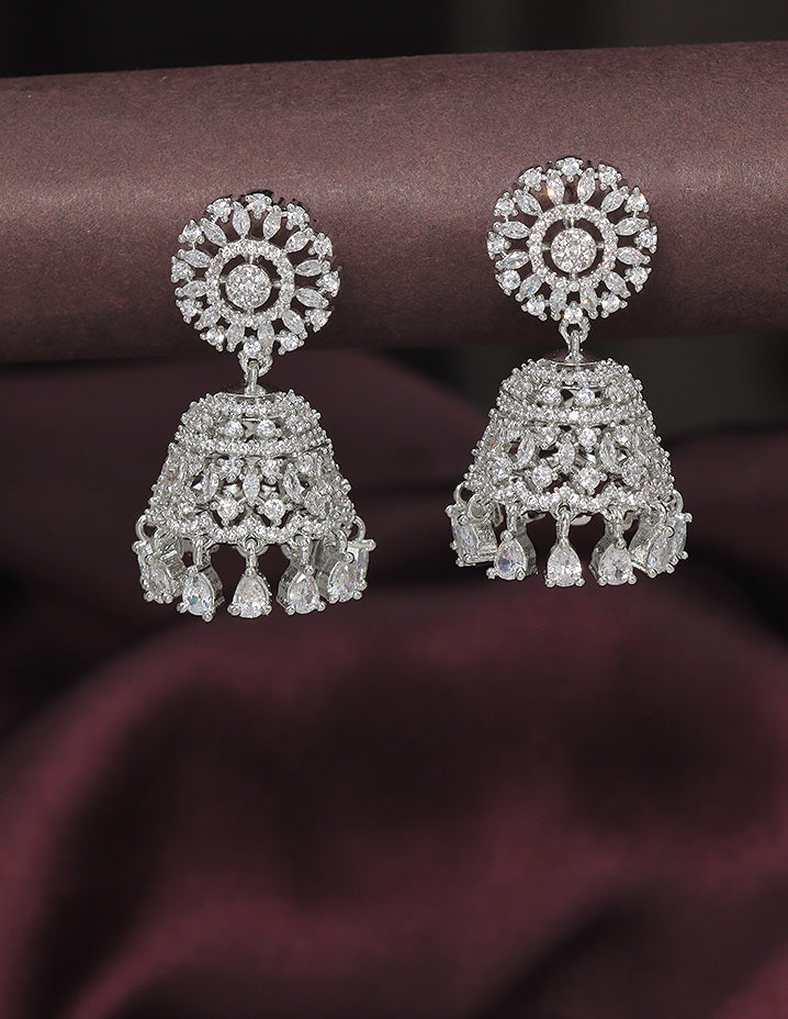 Designer earrings are classic jhumka-style danglers with a fusion of traditional and contemporary design. The bell-shaped drop is richly embellished with white stones and tear-drop dangles, paired with a sparkling oval top.