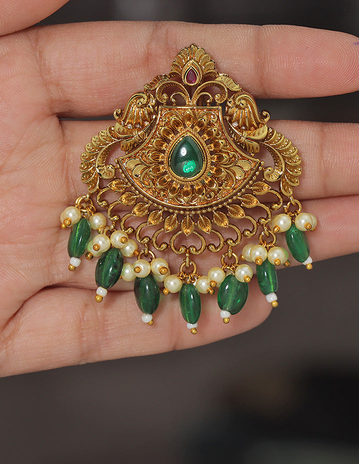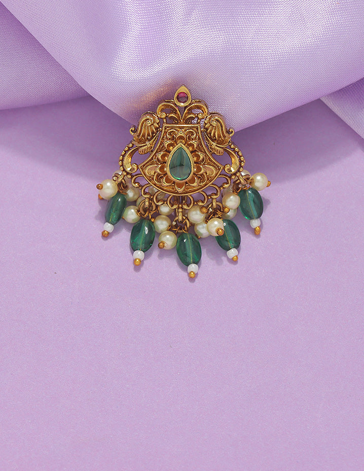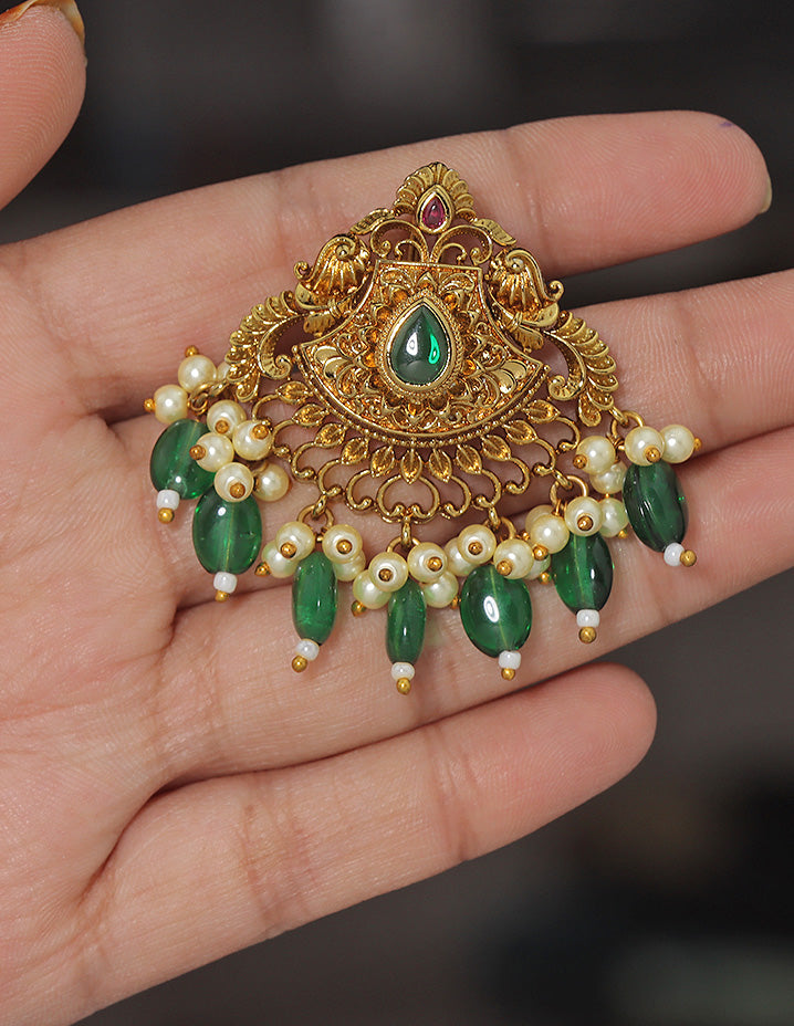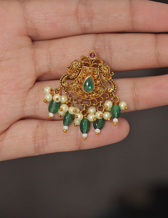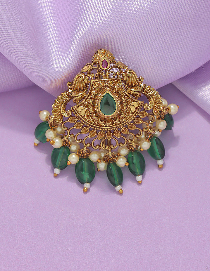 A majestic temple-style Choti Piece featuring an ornate gold finish, centered ruby stone, intricate motifs, and rich danglings of pearls and Emerald beads—perfect for traditional grandeur.