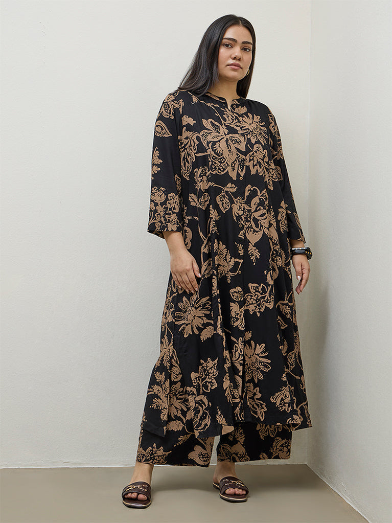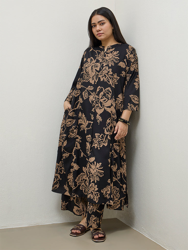 Bring effortless elegance to your everyday wardrobe with this black kurta from Diza. Set in a flattering A-line silhouette, it is adorned with vibrant floral motifs that add a festive lift without feeling overdone. Crafted from a lightweight fabric, the design features a mandarin neck, button-up front, and three-quarter sleeves for a polished finish. Thoughtful side pockets lend everyday ease, making it a comfortable choice for casual gatherings, workdays, or relaxed festive moments.