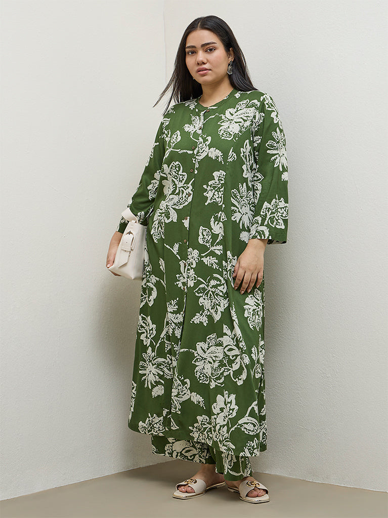 Designed for comfort with a hint of celebration, this green kurta from Diza features lively floral motifs across an easy A-line silhouette. The soft, breathable fabric keeps it light on the skin, while the band neck, button-up front, and three-quarter sleeves add a refined structure. Finished with functional side pockets, it is a versatile pick for daytime festivities, casual outings, or unhurried weekday wear.
