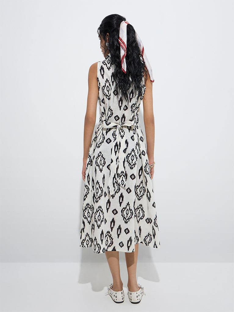 Bombay Paisley White Ikat Printed Cotton Shirt Dress