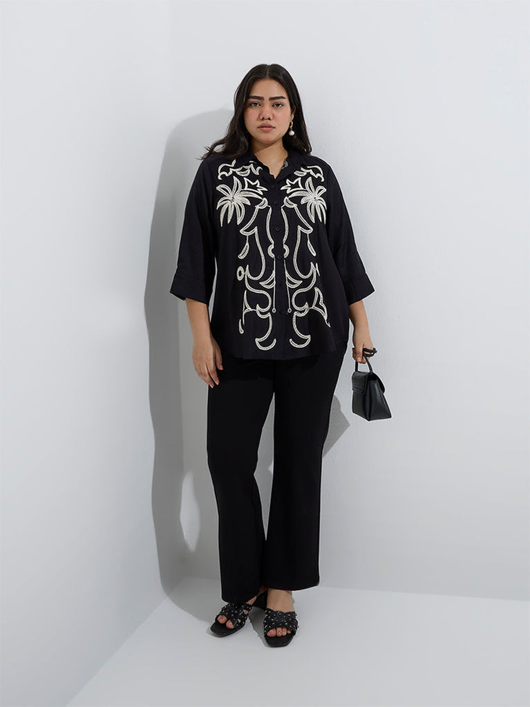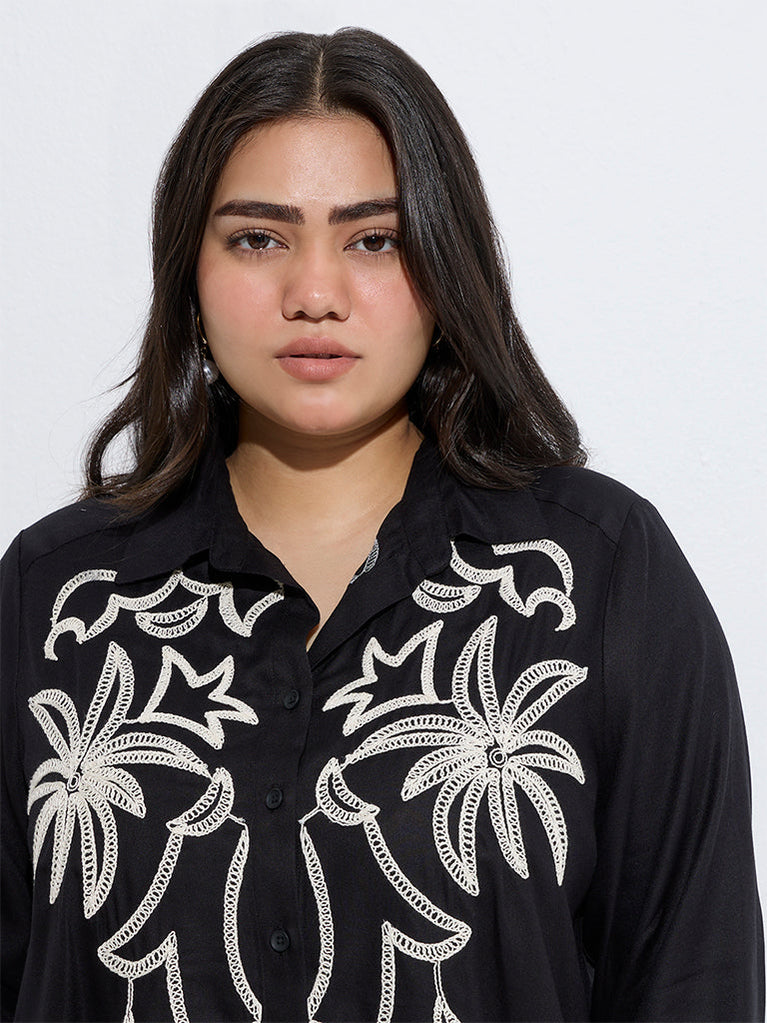 Spun from a lightweight fabric, this black shirt from Gia showcases intricate embroidery at the front for a touch of elegance. It’s styled with a spread collar, a button placket, and three-quarter sleeves.