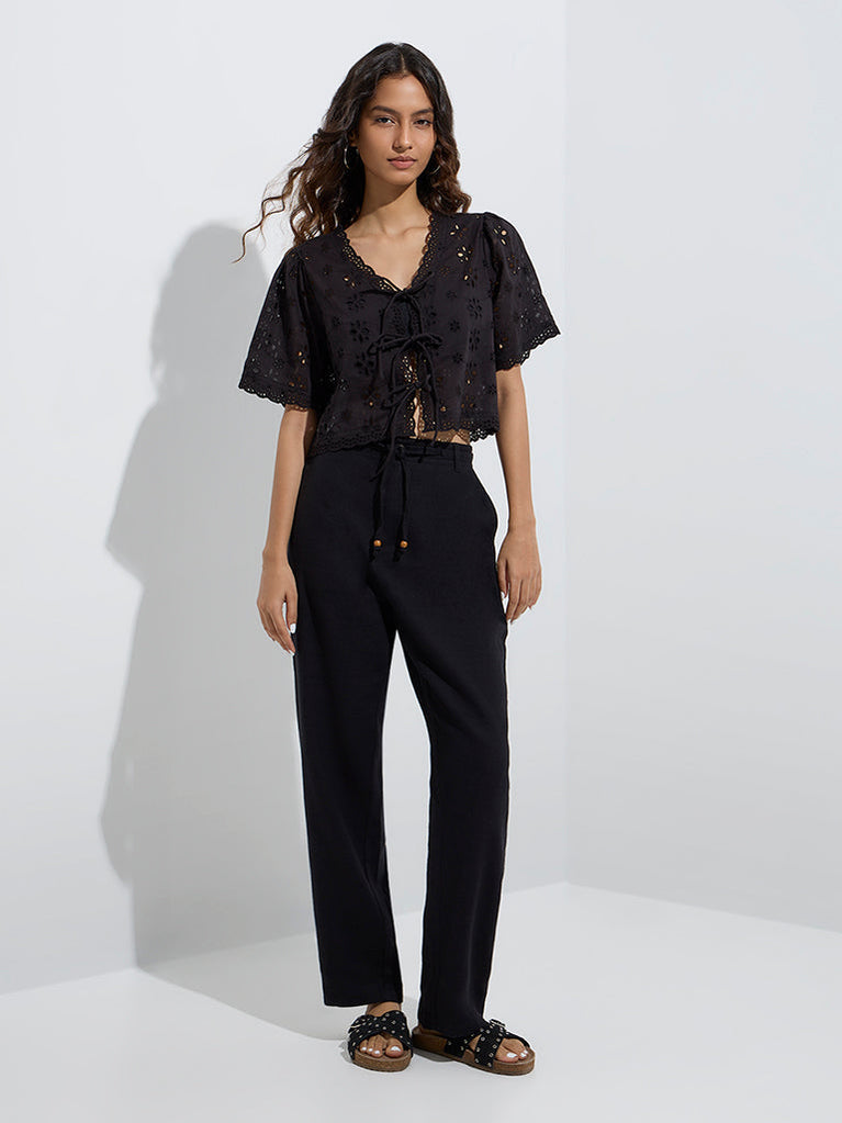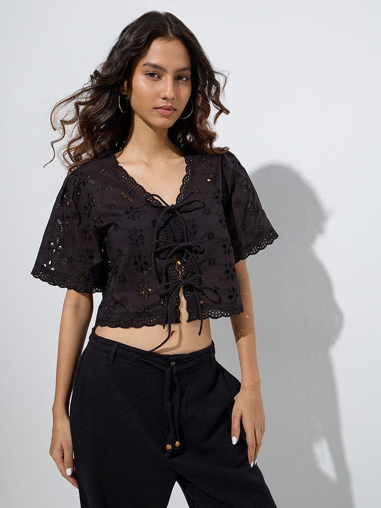 This black top from Bombay Paisley highlights schiffli embroidery for an elegant look. Crafted from pure cotton for daily comfort, the V-neck is framed with a scalloped edge and finished with a delicate tie-up detail at the front, while half sleeves lend a breezy and feminine touch.