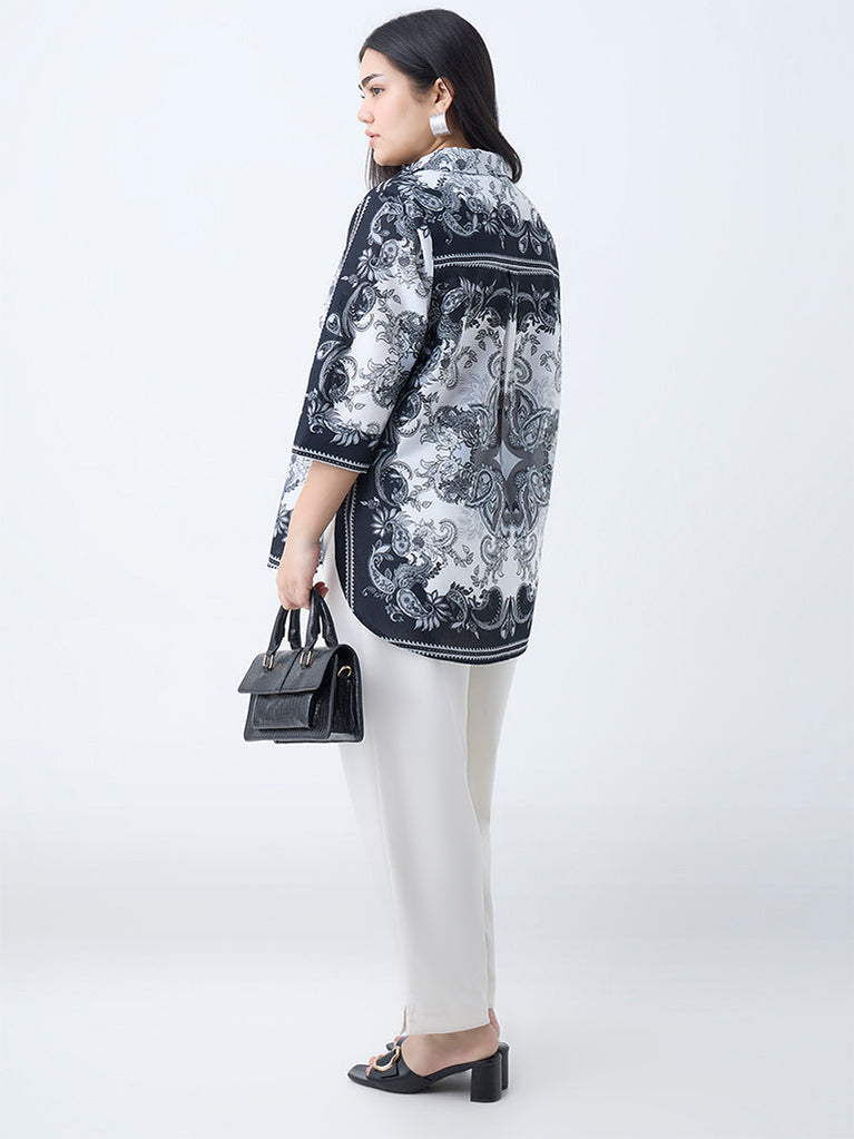 Effortless charm meets timeless detail in this black shirt from Gia, adorned with delicate paisley motifs. Spun from pure cotton for elevated comfort, it features a classic collar that flows into a button placket, while three-quarter sleeves lend a polished finish.