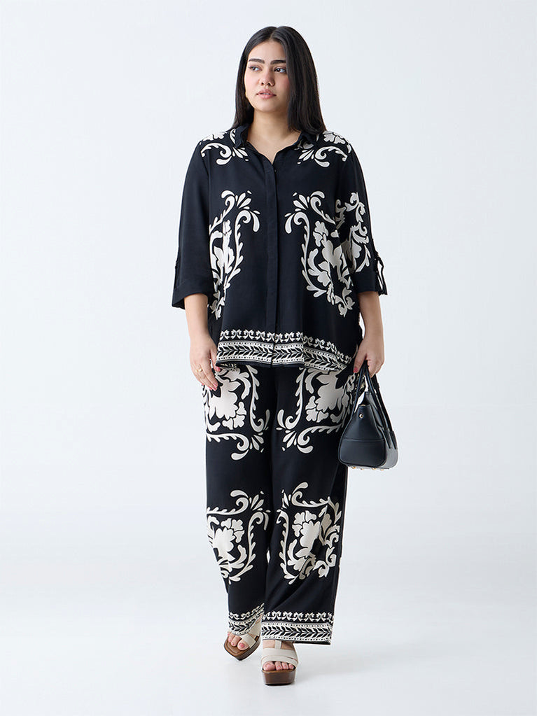 Ascot Black Leaf Design Relaxed-Fit Cotton-Blend Shirt