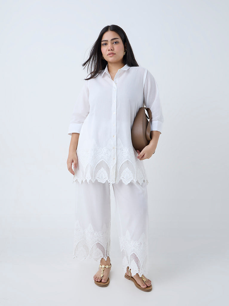 These white ethnic pants from Diza are a versatile staple with elevated accents. Created from a breezy fabric, they flaunt floral embroidery along the hems for a refined finish. An elasticated waistband with drawstring ties ensures comfort, while side pockets add a touch of practicality.