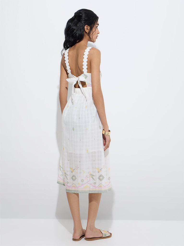 This white dress from Bombay Paisley flaunts nature-inspired prints in an A-line silhouette for graceful movement. Spun from pure cotton, it’s styled with a square neck, scalloped shoulder straps, and a charming bow detail at the back for a flattering finish.