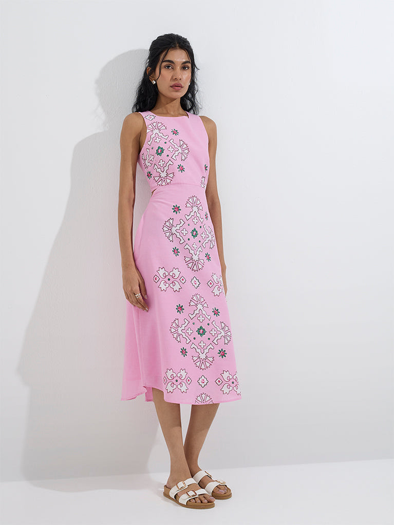 Spun from a premium cotton-linen blend, this pink dress by Bombay Paisley showcases bold prints that make a statement. The cut-out detailing at the waist add a touch of edge, while the zipper back ensures easy wearability.