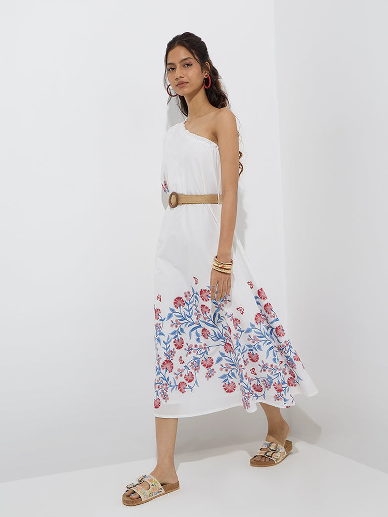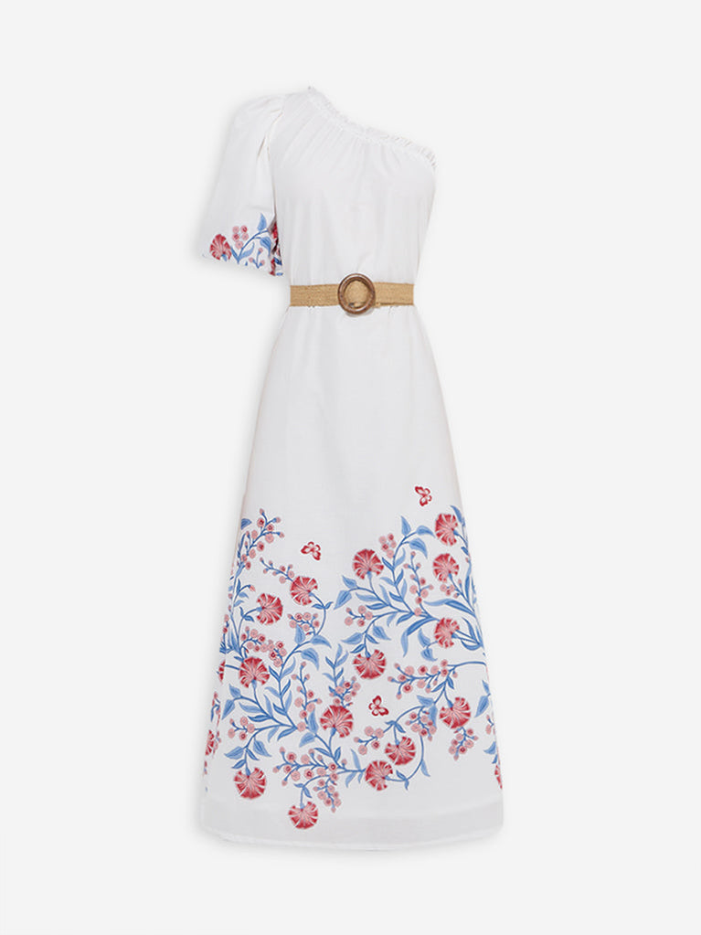 Bombay Paisley Off-White Floral Cotton One-Shoulder Dress
