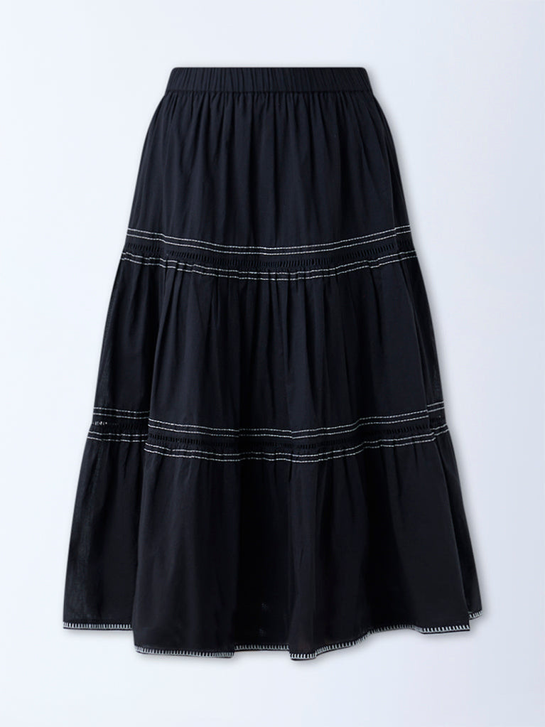 A contemporary staple with artisanal charm, this black skirt from Bombay Paisley is crafted in pure cotton and accented with striped embroidery for subtle texture. The elasticated waistband ensures a flexible fit, while side pockets lend a dose of practicality.