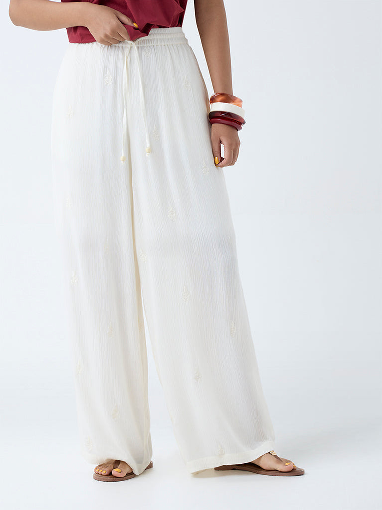 These white pants from Bombay Paisley are made from a crinkle-textured fabric that brings subtle dimension to your off-duty looks. Embroidered detailing adds a touch of character, while the elasticated waistband with adjustable drawstrings ensures a personalised fit. Finished with side pockets for added function, they’re an easygoing essential made for relaxed days.
