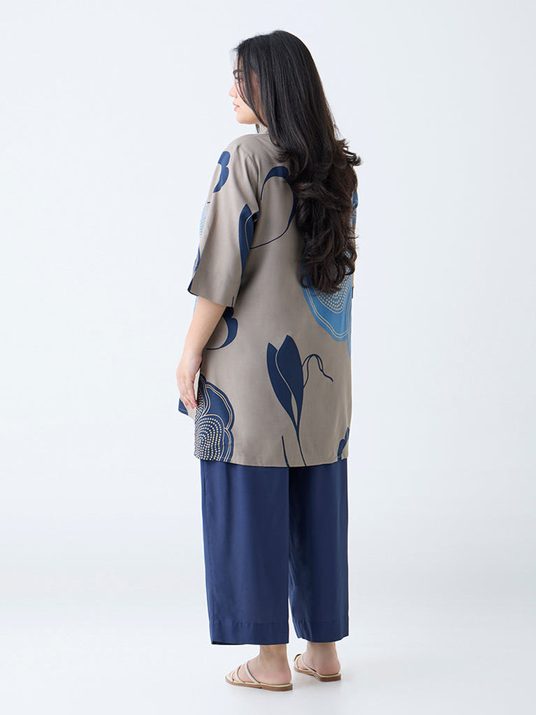 Celebrate effortless elegance with this taupe tunic from Diza, adorned with delicate floral and bandhani patterns. Cut from a lightweight fabric for a luxuriously gentle drape, it’s styled with a collar and half sleeves for all-day comfort and charm.