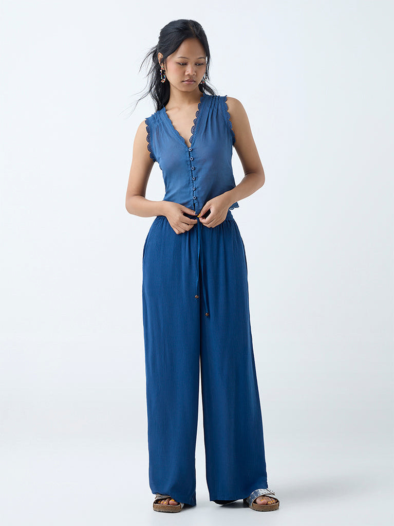 These indigo pants from Bombay Paisley are cut from a lightweight, crinkle-textured fabric that lends a relaxed yet refined feel. Designed for comfort, they feature an elasticated waistband with adjustable drawstrings and practical side pockets.