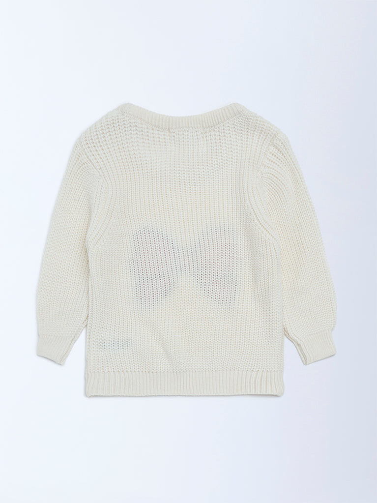 Add a touch of sweetness to your baby’s wardrobe with this cream sweater by HOP Baby, finished with a charming embellished bow at the front. Crafted from a soft knit-textured fabric, it features a crew neck and full sleeves that keep them warm and cosy through cooler days.