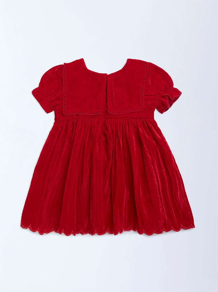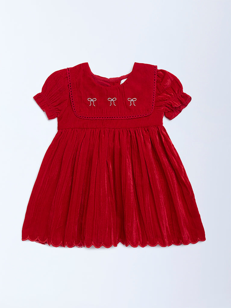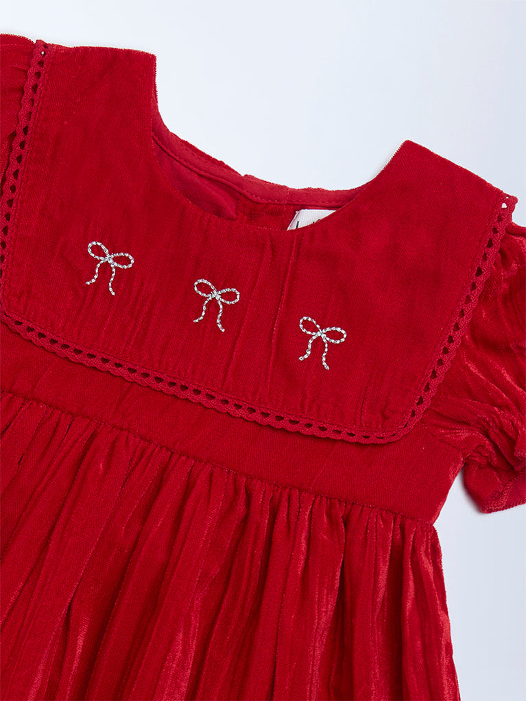 This red dress from HOP Baby is a charming pick for little ones. The fit-and-flare silhouette pairs beautifully with the crew neck, which is dotted with embroidered bows and crochet trims. Finished with puffed sleeves and a scalloped hemline, it brings a sweet, picture-ready look to any occasion.
