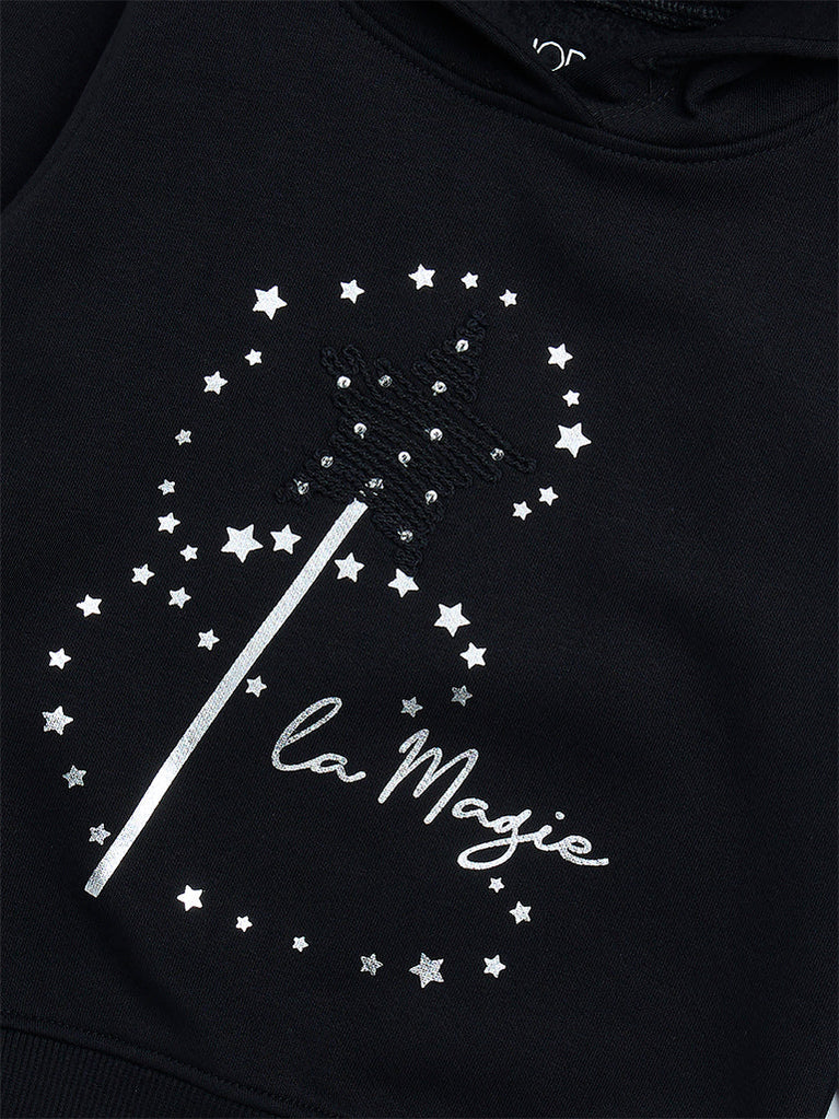Revel in cosy style with this black hoodie from HOP Kids. Designed with a magical star–wand graphic and text design, it brings a playful, whimsical touch to everyday wear. The soft fabric, hooded neckline and ribbed cuffs keep your little one warm and comfortable.
