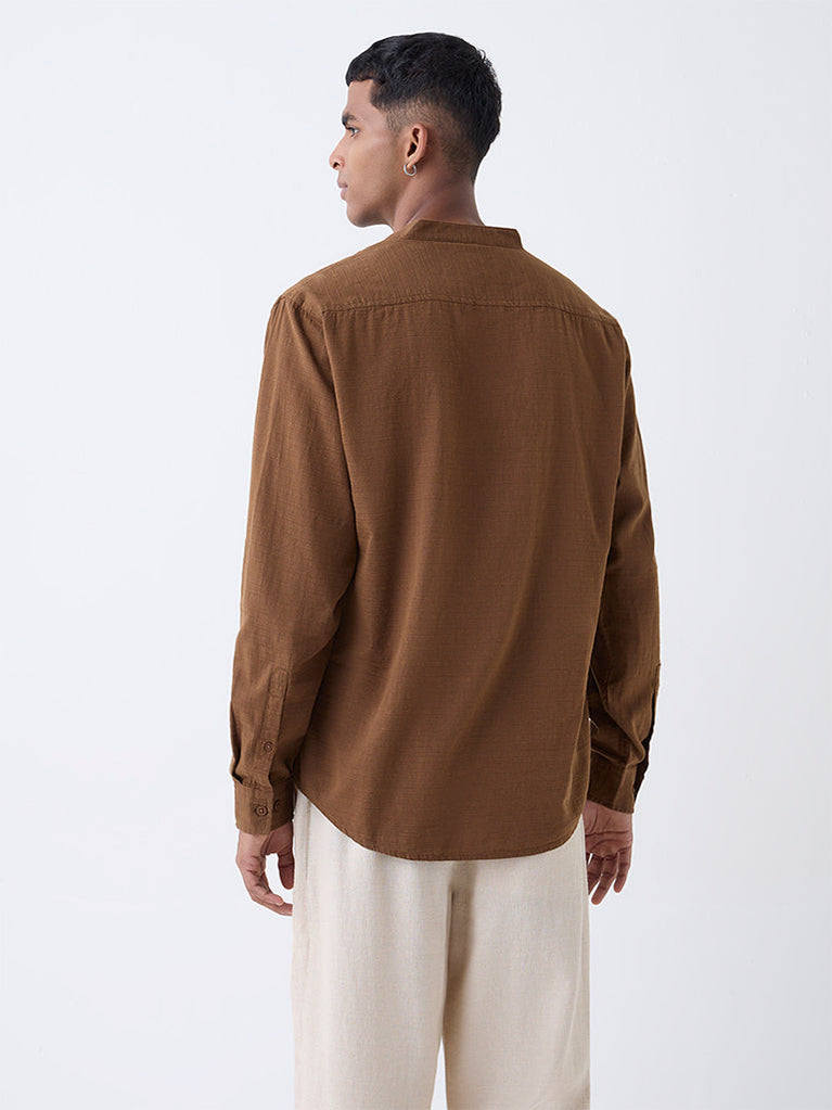 Easy days call for effortless style, and this brown self-patterned shirt from ETA fits right in. Crafted from a soft cotton blend, it features a relaxed fit and band collar that lend a breezy, modern edge. The subtle texture adds quiet depth, while the full sleeves make it ideal for laid-back evenings or café strolls by the coast.