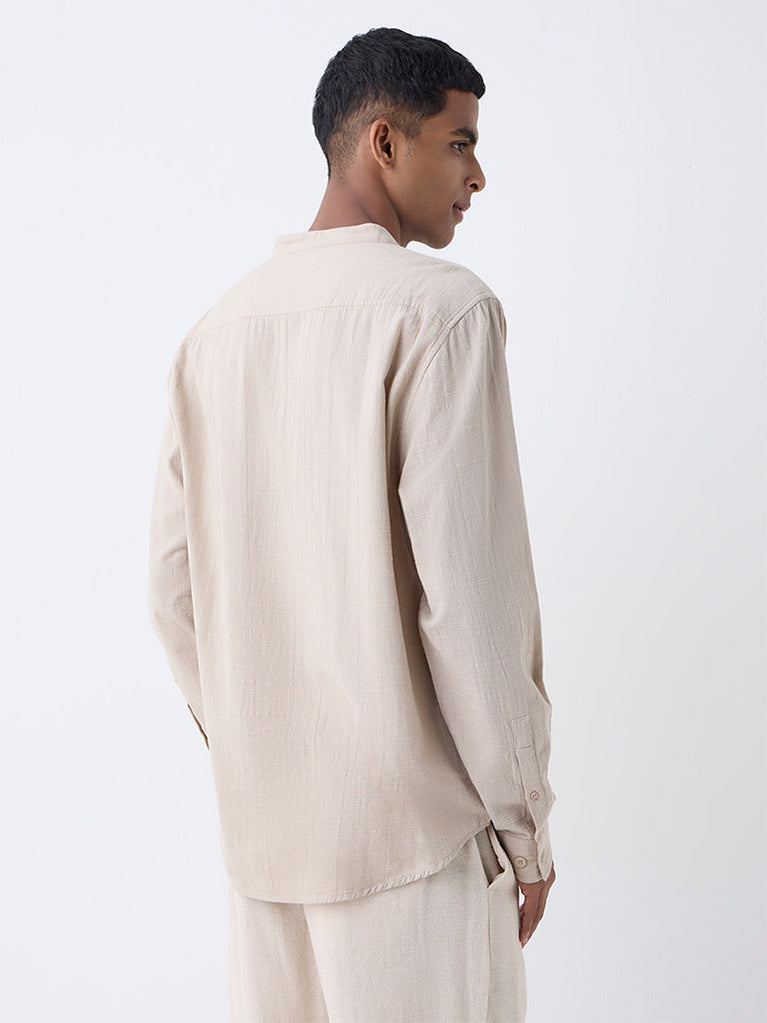 Bring effortless sophistication to your wardrobe with this beige shirt from ETA. Shaped in a relaxed silhouette, it features a band collar, a short button-up front and full sleeves. Spun from a breathable fabric with a textured finish, it serves as a versatile staple for refined occasions.